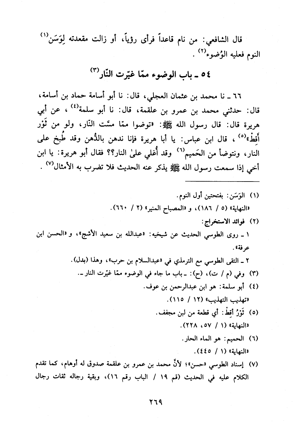 66 - نَا مُحَمَّدُ بْنُ عُثْمَانَ الْعِجْلِيُّ قَالَ نَا أَبُو أُسَامَةَ حَمَّادُ بْنُ أُسَامَةَ قَالَ حَدَّثَنِي مُحَمَّدُ بْنُ عَمْرِو بْنِ عَلْقَمَةَ قَالَ نَا أَبُو سَلَمَةَ عَنْ أَبِي هُرَيْرَةَ قَالَ قَالَ رَسُولُ اللَّهِ صلى الله عَلَيْهِ وَسلم توضوا مِمَّا مَسَّتِ النَّارُ وَلَوْ مِنْ ثَوْرِ أَقِطٍّ قَالَ ابْنُ عَبَّاسٍ يَا أَبَا هُرَيْرَةَ فَإِنَّا نَدَّهِنُ بِالدُّهْنِ وَقَدْ طُبِخَ عَلَى النَّارِ وَنَتَوَضَّأُ مِنَ الْحَمِيمِ وَقَدْ أُغْلِيَ عَلَى النَّارِ فَقَالَ أَبُو هُرَيْرَة يَا ابْن أَخِي إِذَا سَمِعْتَ رَسُولَ اللَّهِ صَلَّى اللَّهُ عَلَيْهِ وَسَلَّمَ يُذْكَرُ عَنْهُ الْحَدِيثُ فَلا تَضْرِبْ بِهِ الْأَمْثَال