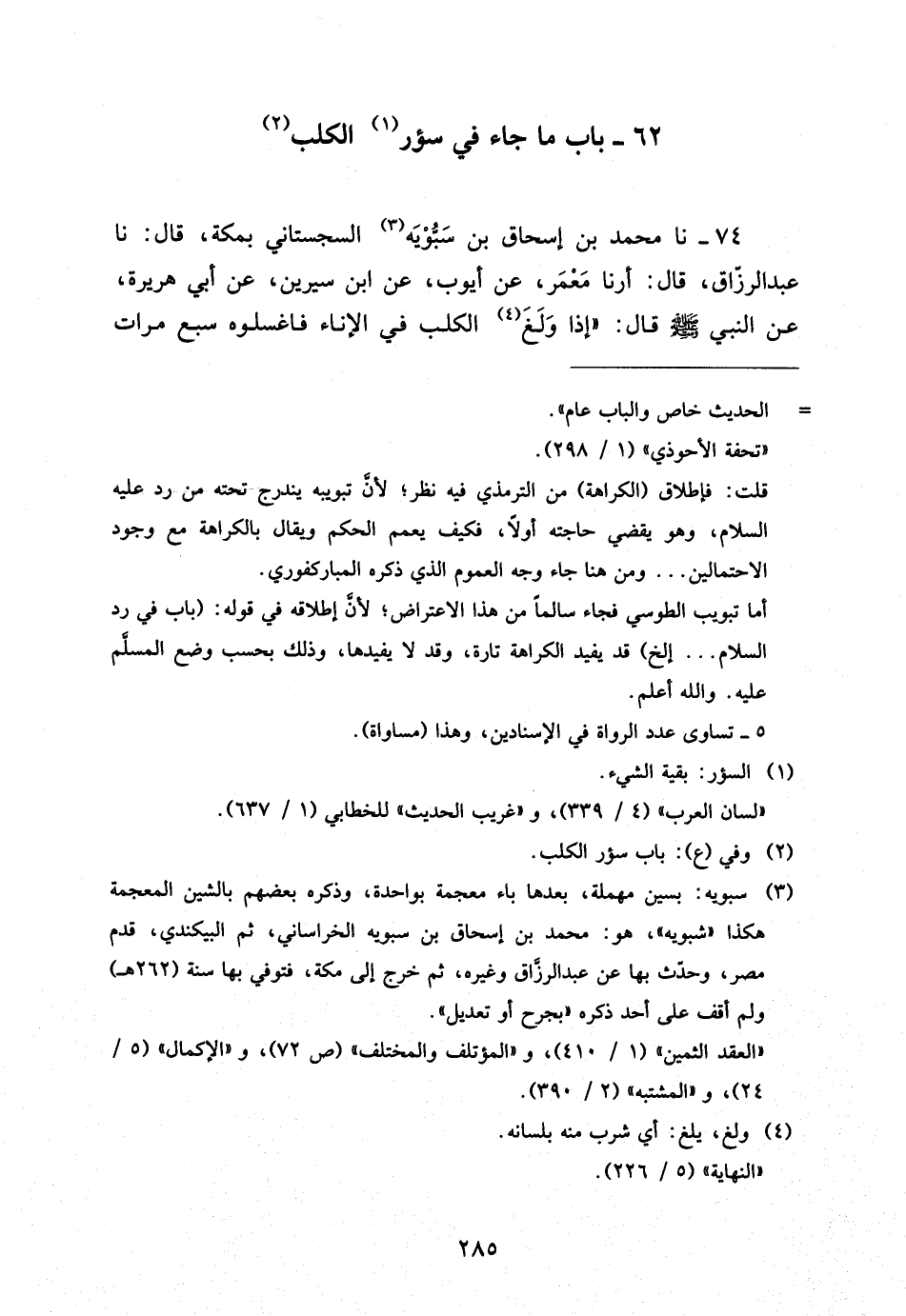 74 - نَا مُحَمَّدُ بْنُ إِسْحَاقَ بْنِ سَبُّوَيْهِ السِّجِسْتَانِيُّ بِمَكَّةَ قَالَ نَا عَبْدُ الرَّزَّاقِ قَالَ أرنا مَعْمَرٌ عَنْ أَيُّوبَ عَنِ ابْنِ سِيرِينَ عَنْ أَبِي هُرَيْرَةَ عَنِ النَّبِيِّ صَلَّى اللَّهُ عَلَيْهِ وَسَلَّمَ قَالَ إِذَا وَلَغَ الْكَلْبُ فِي الإِنَاءِ فَاغْسِلُوهُ سبع مَرَّات