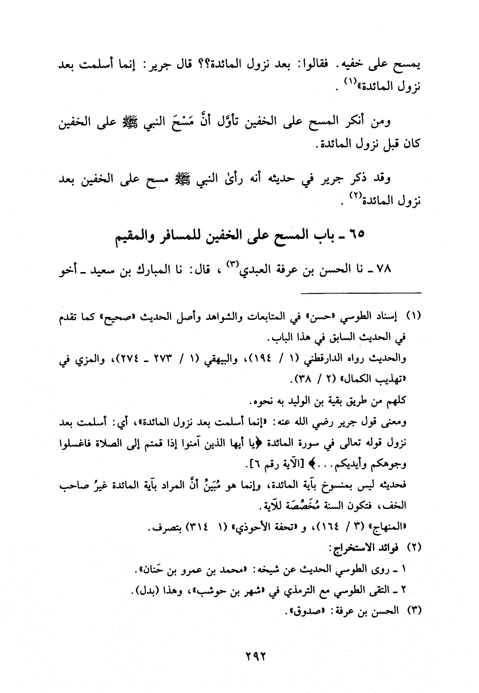 وَقَدْ ذَكَرَ جَرِيرٌ فِي حَدِيثِهِ أَنَّهُ رَأَى النَّبِيَّ صَلَّى اللَّهُ عَلَيْهِ وَسَلَّمَ مَسَحَ عَلَى الْخُفَّيْنِ بَعْدَ نُزُولِ الْمَائِدَةِ