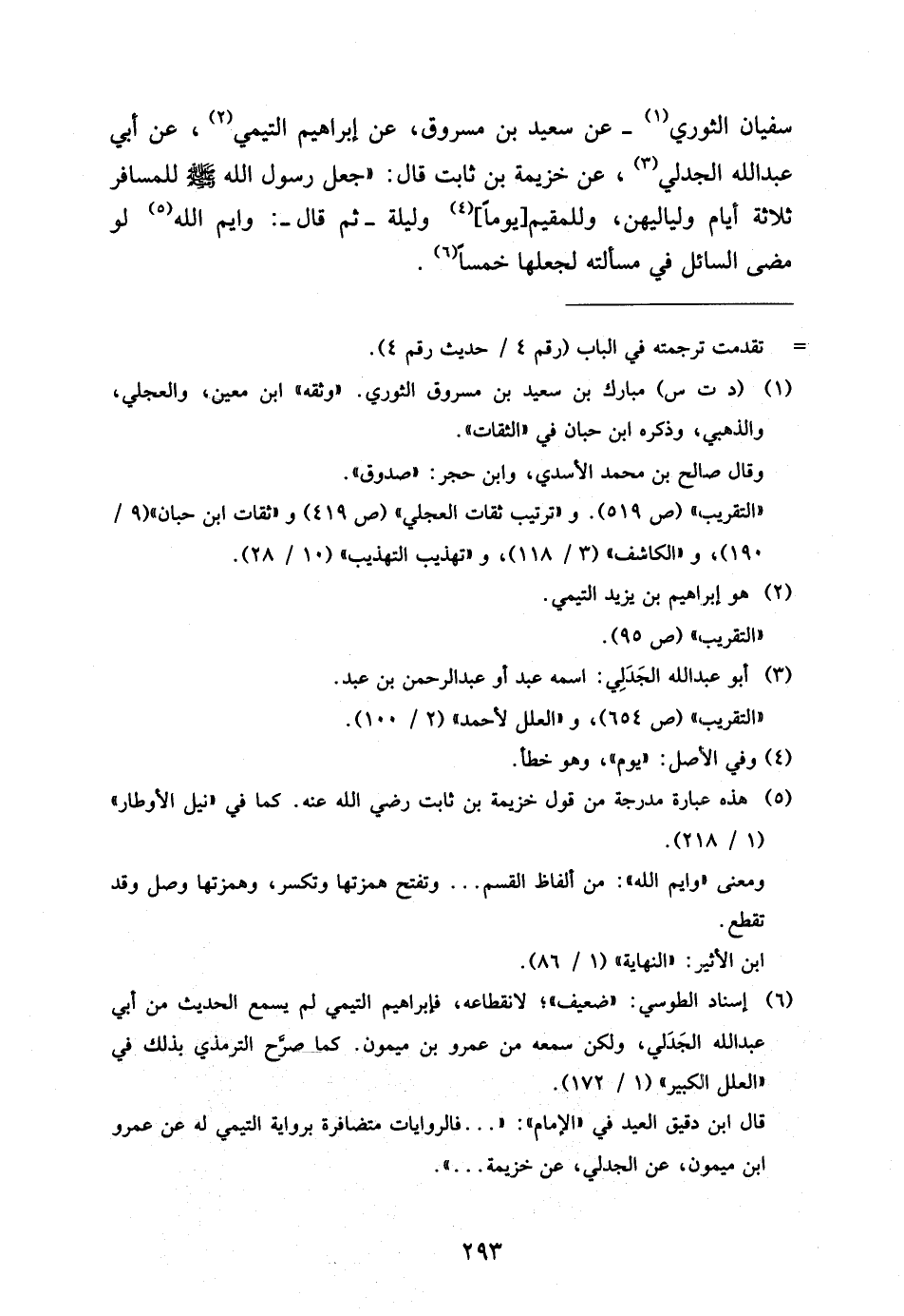 سُفْيَانَ الثَّوْرِيُّ عَنْ سَعِيدِ بْنِ مَسْرُوقٍ عَنْ إِبْرَاهِيمَ التَّيْمِيِّ عَنْ أَبِي عَبْدِ اللَّهِ الْجَدَلِيِّ عَنْ خُزَيْمَةَ بْنِ ثَابِتٍ قَالَ جَعَلَ رَسُولُ اللَّهِ صَلَّى اللَّهُ عَلَيْهِ وَسَلَّمَ لِلْمُسَافِرِ ثَلاثَةَ أَيَّامٍ وَلَيَالِيهِنَّ وَلِلْمُقِيمِ يَوْمًا وَلَيْلَةً ثُمَّ قَالَ وَايْمُ اللَّهِ لَوْ مَضَى السَّائِلُ فِي مَسْأَلَتِهِ لجعلها خمْسا