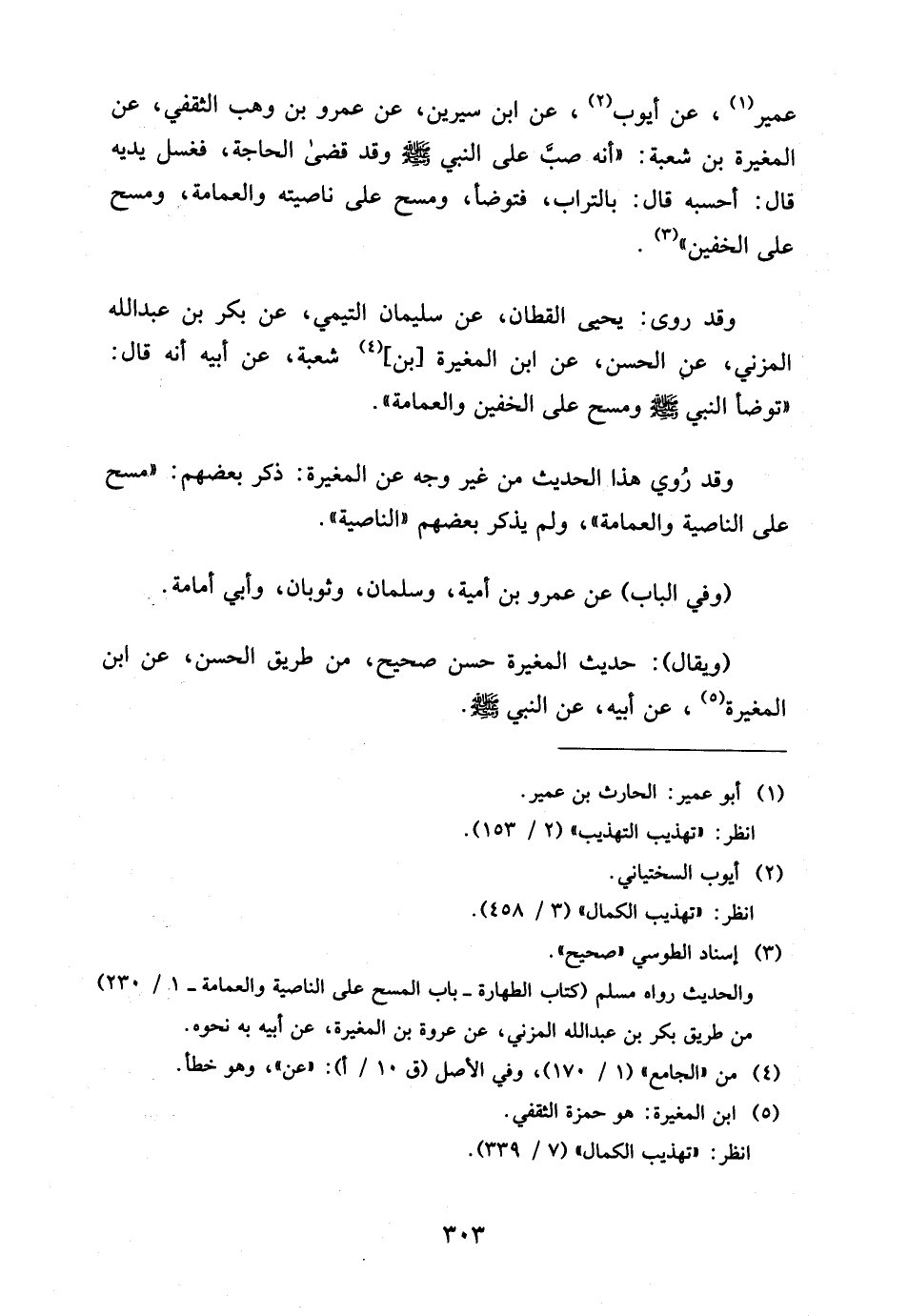 وَقَدْ رُوِيَ هَذَا الْحَدِيثُ مِنْ غَيْرِ وَجْهٍ عَنِ الْمُغِيرَةِ ذَكَرَ بَعْضُهُمْ مَسَحَ عَلَى النَّاصِيَةِ وَالْعِمَامَةِ وَلَمْ يَذْكُرْ بَعْضُهُمُ النَّاصِيَةَ