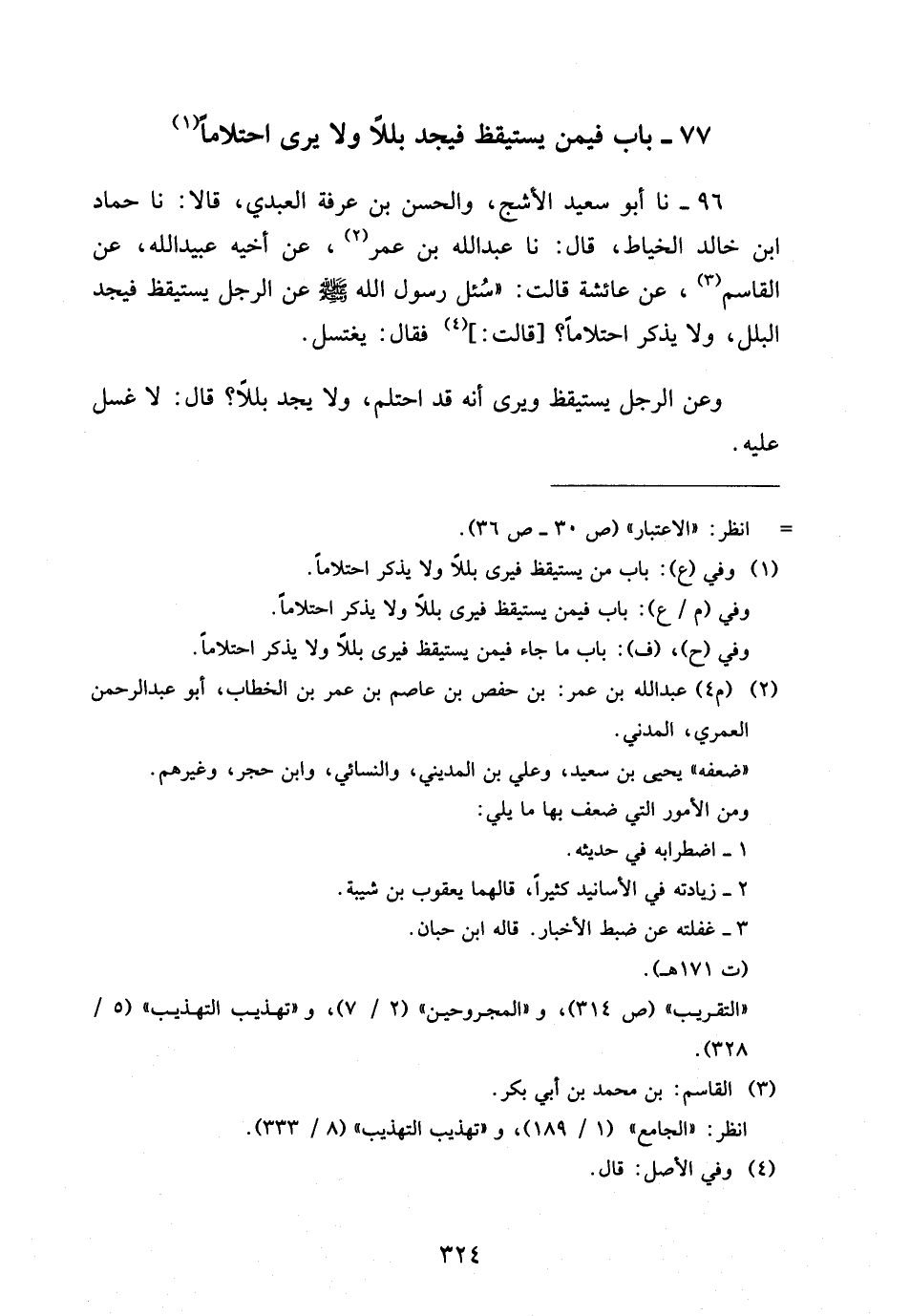 96 - نَا أَبُو سَعِيدٍ الأَشَجُّ وَالْحَسَنُ بْنُ عَرَفَة الْعَبْدي قَالَا نَا حَمَّاد ابْن خَالِدٍ الْخَيَّاطُ قَالَ نَا عَبْدُ اللَّهِ بْنُ عُمَرَ عَنْ أَخِيهِ عُبَيْدِ اللَّهِ عَنِ الْقَاسِمِ عَنْ عَائِشَةَ قَالَتْ سُئِلَ رَسُولُ اللَّهِ صَلَّى اللَّهُ عَلَيْهِ وَسَلَّمَ عَنِ الرَّجُلِ يَسْتَيْقِظُ فَيَجِدُ الْبَلَلَ وَلا يَذْكُرِ احْتِلامًا قَالَتْ فَقَالَ يَغْتَسِلُ