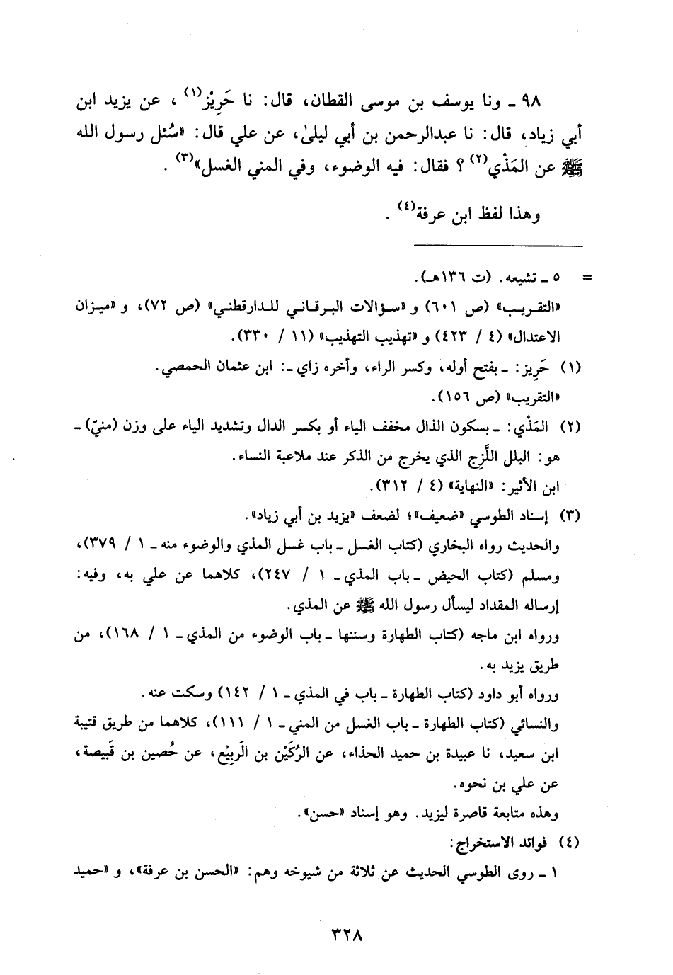 98 - وَنا يُوسُفُ بْنُ مُوسَى الْقَطَّانُ قَالَ نَا حريز عَن يزِيد ابْن أَبِي زِيَادٍ قَالَ نَا عَبْدُ الرَّحْمَنِ بْنُ أَبِي لَيْلَى عَنْ عَلِيٍّ قَالَ سُئِلَ رَسُولُ اللَّهِ صَلَّى اللَّهُ عَلَيْهِ وَسَلَّمَ عَنِ الْمَذْيِ فَقَالَ فِيهِ الْوُضُوءُ وَفِي الْمَنِيِّ الْغُسْلُ