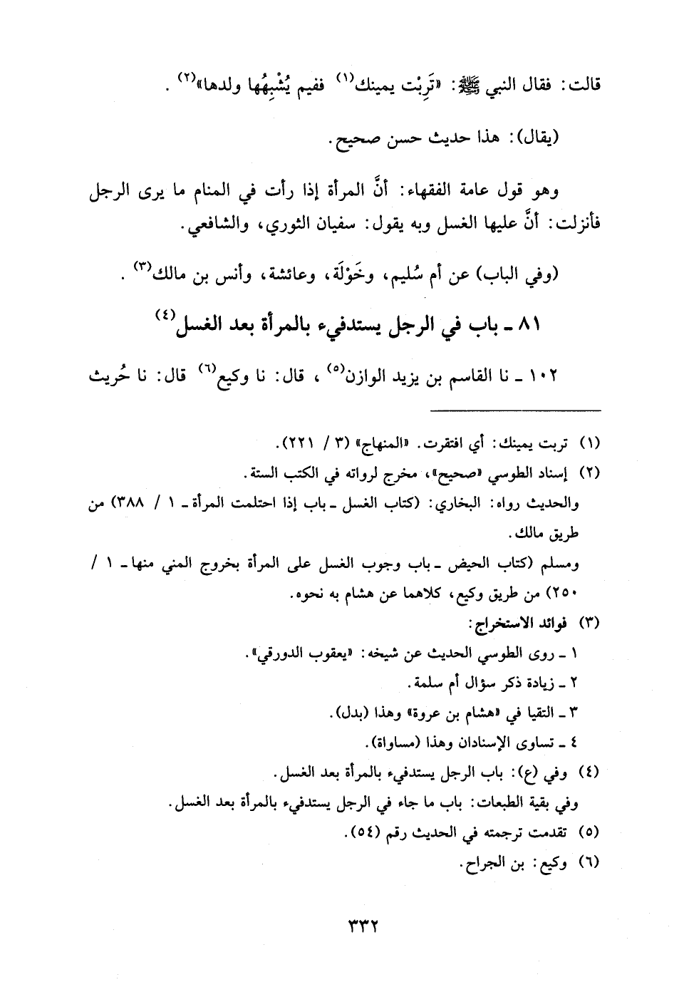 وَهُوَ قَوْلُ عَامَّةِ الْفُقَهَاءِ أَنَّ الْمَرْأَةَ إِذَا رَأَتْ فِي الْمَنَامِ مَا يَرَى الرَّجُلُ فَأَنْزَلَتْ أَنَّ عَلَيْهَا الْغُسْلَ وَبِهِ يَقُولُ سُفْيَانُ الثَّوْرِيُّ وَالشَّافِعِيُّ