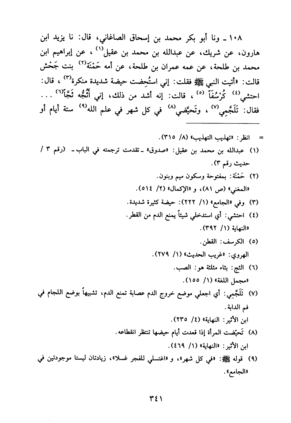 108 - وَنا أَبُو بَكْرٍ مُحَمَّدُ بْنُ إِسْحَاقَ الصَّاغَانِيُّ قَالَ نَا يزِيد ابْن هَارُونَ عَنْ شَرِيكٍ عَنْ عَبْدِ اللَّهِ بْنِ مُحَمَّد بن عقيل عَن إِبْرَاهِيم ابْن مُحَمَّد ابْن طَلْحَةَ عَنْ عَمِّهِ عِمْرَانَ بْنِ طَلْحَةَ عَنْ أمه حمْنَة بنت جحش قالتأتيت النَّبِيَّ صَلَّى اللَّهُ عَلَيْهِ وَسَلَّمَ فَقُلْتُ إِنِّي اسْتَحَضْتُ حَيْضَةً شَدِيدَةً مُنْكَرَةً قَالَ احْتَشِي كُرْسُفًا قَالَتْ إِنَّهُ أَشَدُّ مِنْ ذَلِكَ إِنِّي أَثُجُّهُ ثَجًّا فَقَالَ تَلَجَّمِي وَتَحَيَّضِي فِي كُلِّ شَهْرٍ فِي عِلْمِ اللَّهِ سِتَّةَ أَيَّامٍ أَوْ
