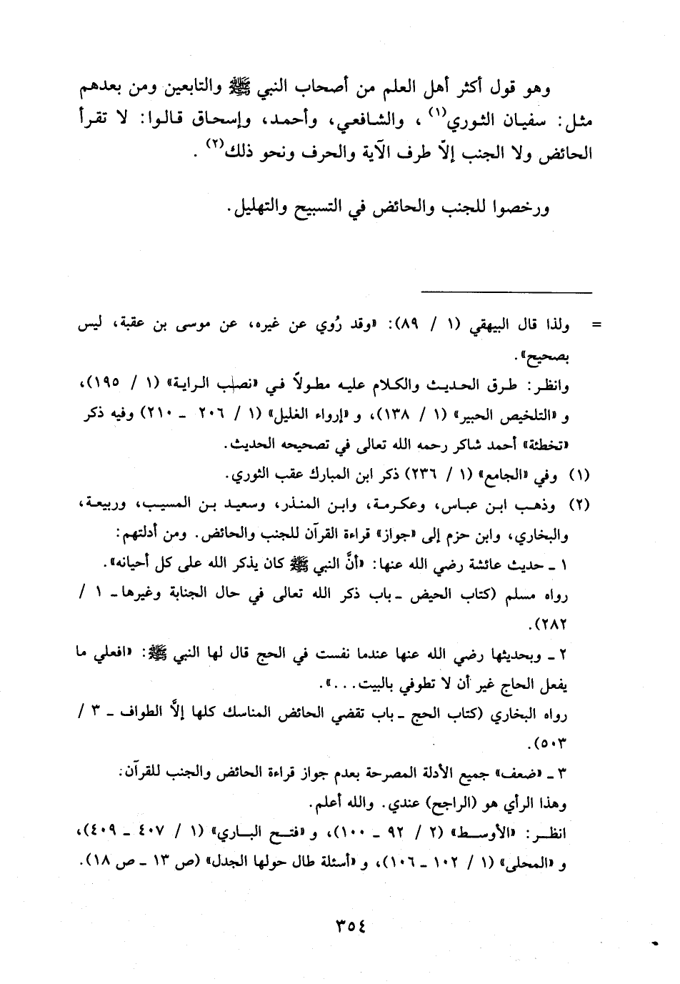 وَهُوَ قَوْلُ أَكْثَرِ أَهْلِ الْعِلْمِ مِنْ أَصْحَابِ النَّبِيِّ صَلَّى اللَّهُ عَلَيْهِ وَسَلَّمَ وَالتَّابِعِينَ وَمَنْ بَعْدَهُمْ مِثْلُ سُفْيَانَ الثَّوْرِيِّ وَالشَّافِعِيِّ وَأَحْمَدَ وَإِسْحَاقَ قَالُوا لَا تَقْرَأُ الْحَائِضُ وَلا الْجُنُبُ إِلا طَرَفَ الآيَةِ وَالْحَرْفَ وَنَحْوَ ذَلِكَ