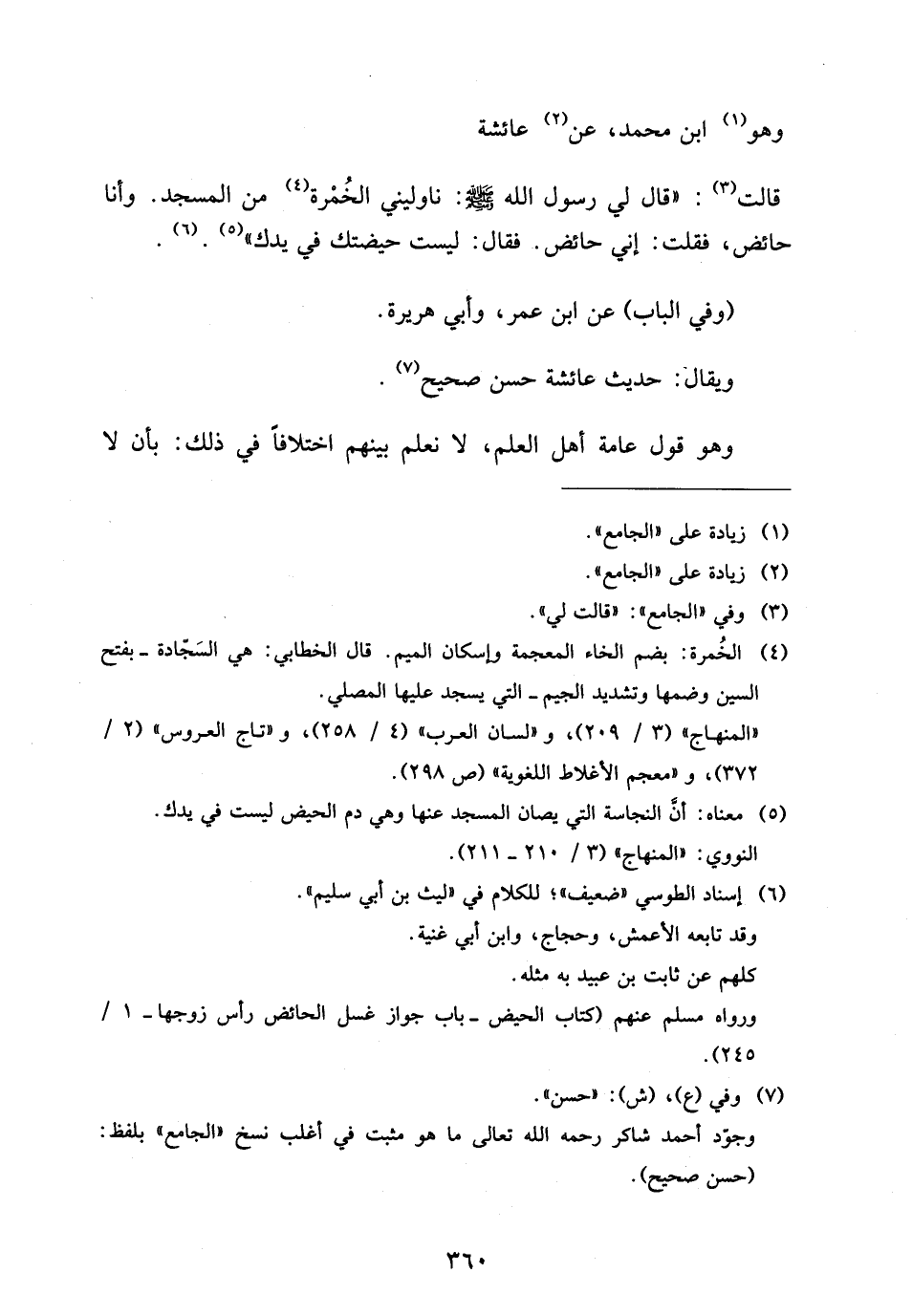 قَالَتْ قَالَ لِي رَسُولُ اللَّهِ صَلَّى اللَّهُ عَلَيْهِ وَسَلَّمَ نَاوِلِينِي الْخُمْرَةَ مِنَ الْمَسْجِدِ وَأَنَا حَائِضٌ فَقُلْتُ إِنِّي حَائِضٌ فَقَالَ لَيْسَتْ حَيْضَتُكِ فِي يَدِكِ