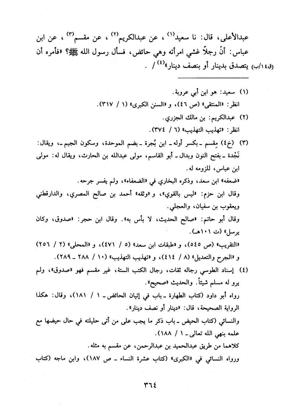 عَبْدِ الأَعْلَى قَالَ نَا سَعِيدٌ عَنْ عَبْدِ الْكَرِيمِ عَنْ مِقْسَمٍ عَنِ ابْنِ عَبَّاسٍ أَنَّ رَجُلا غَشِيَ امْرَأَتَهُ وَهِيَ حَائِضٌ فَسَأَلَ رَسُولَ اللَّهِ صَلَّى اللَّهُ عَلَيْهِ وَسَلَّمَ فَأَمَرَهُ أَنْ يَتَصَدَّقَ بِدِينَارٍ أَوْ بِنِصْفِ دِينَارٍ