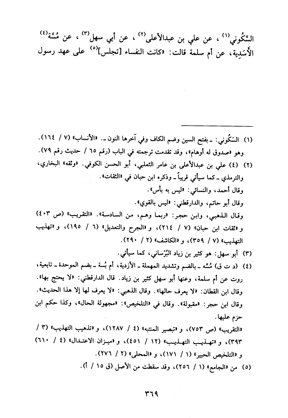 السَّكُونِيُّ عَنْ عَلِيِّ بْنِ عَبْدِ الأَعْلَى عَنْ أَبِي سَهْلٍ عَنْ مُسَّةَ الأَسَدِيَّةِ عَنْ أُمِّ سَلَمَةَ قَالَتْ كَانَتِ النَّفْسَاءُ تَجْلِسُ عَلَى عَهْدِ رَسُول
