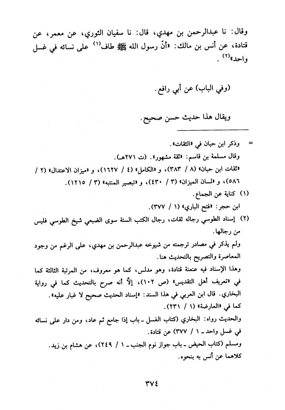 وَقَالَ نَا عَبْدُ الرَّحْمَنِ بْنِ مَهْدِيٍّ قَالَ نَا سُفْيَانُ الثَّوْرِيُّ عَنْ مَعْمَرٍ عَنْ قَتَادَةَ عَنْ أَنَسِ بْنِ مَالِكٍ أَنَّ رَسُولَ اللَّهِ صَلَّى اللَّهُ عَلَيْهِ وَسَلَّمَ طَافَ عَلَى نِسَائِهِ فِي غُسْلٍ وَاحِدٍ