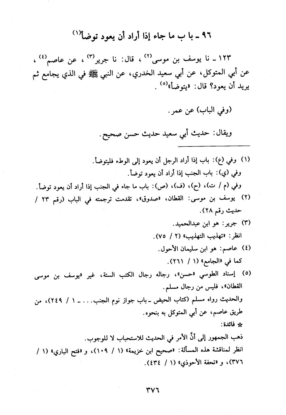 123 - نَا يُوسُفُ بْنُ مُوسَى قَالَ نَا جَرِيرٌ عَنْ عَاصِمٍ عَنْ أَبِي الْمُتَوَكِّلِ عَنْ أَبِي سَعِيدٍ الْخُدْرِيِّ عَنِ النَّبِيِّ صَلَّى اللَّهُ عَلَيْهِ وَسَلَّمَ فِي الَّذِي يُجَامِعُ ثُمَّ يُرِيدَ أَنْ يَعُودَ قَالَ يَتَوَضَّأُ