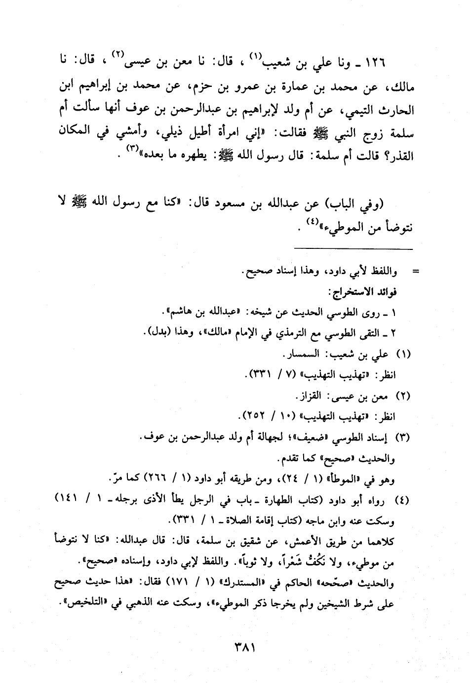 126 - وَنا عَلِيُّ بْنُ شُعَيْبٍ قَالَ نَا مَعْنُ بْنُ عِيسَى قَالَ نَا مَالِكٌ عَنْ مُحَمَّدِ بْنِ عُمَارَةَ بْنِ عَمْرِو بْنِ حَزْمٍ عَنْ مُحَمَّد بن إِبْرَاهِيم ابْن الْحَارِثِ التَّيْمِيِّ عَنْ أُمِّ وَلَدٍ لإِبْرَاهِيمَ بْنِ عَبْدِ الرَّحْمَنِ بْنِ عَوْفٍ أَنَّهَا سَأَلَتْ أُمَّ سَلَمَةَ زَوْجَ النَّبِيِّ صَلَّى اللَّهُ عَلَيْهِ وَسَلَّمَ فَقَالَتْ إِنِّي امْرَأَةٌ أُطِيلُ ذَيْلِي وَأَمْشِي فِي الْمَكَانِ الْقَذِرِ قَالَتْ أُمُّ سَلَمَةَ قَالَ رَسُولُ اللَّهِ صَلَّى اللَّهُ عَلَيْهِ وَسَلَّمَ يُطَهِّرُهُ مَا بَعْدَهُ