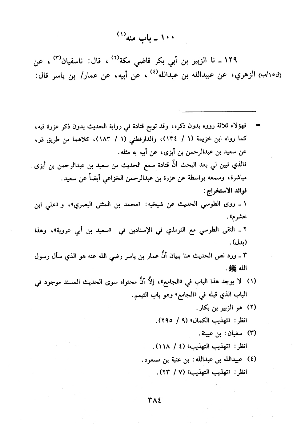 129 - نَا الزُّبَيْرُ بْنُ أَبِي بَكْرٍ قَاضِي مَكَّةَ قَالَ نَا سُفْيَانُ عَنِ الزُّهْرِيِّ عَنْ عُبَيْدِ اللَّهِ بْنِ عَبْدِ اللَّهِ عَنِ أَبِيهِ عَنْ عَمَّارِ بْنِ يَاسِرٍ قَالَ