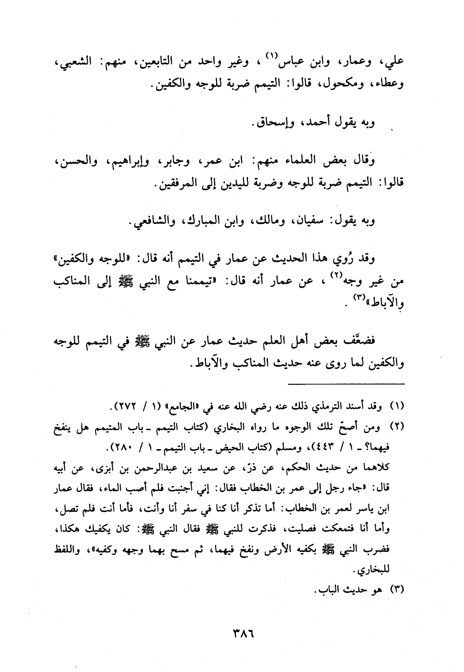 فَضَعَّفَ بَعْضُ أَهْلِ الْعِلْمِ حَدِيثَ عَمَّارٍ عَنِ النَّبِيِّ صَلَّى اللَّهُ عَلَيْهِ وَسَلَّمَ فِي التَّيَمُّمِ لِلْوَجْهِ وَالْكَفَّيْنِ لَمَّا رُوِيَ عَنْهُ حَدِيثُ الْمَنَاكِبِ وَالآبَاطِ