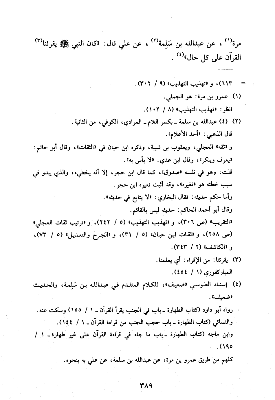 مُرَّةَ عَنْ عَبْدِ اللَّهِ بْنِ سَلَمَةَ عَنْ عَلِيٍّ قَالَ كَانَ النَّبِيُّ صَلَّى اللَّهُ عَلَيْهِ وَسَلَّمَ يُقْرِئُنَا الْقُرْآنَ عَلَى كُلِّ حَالٍ