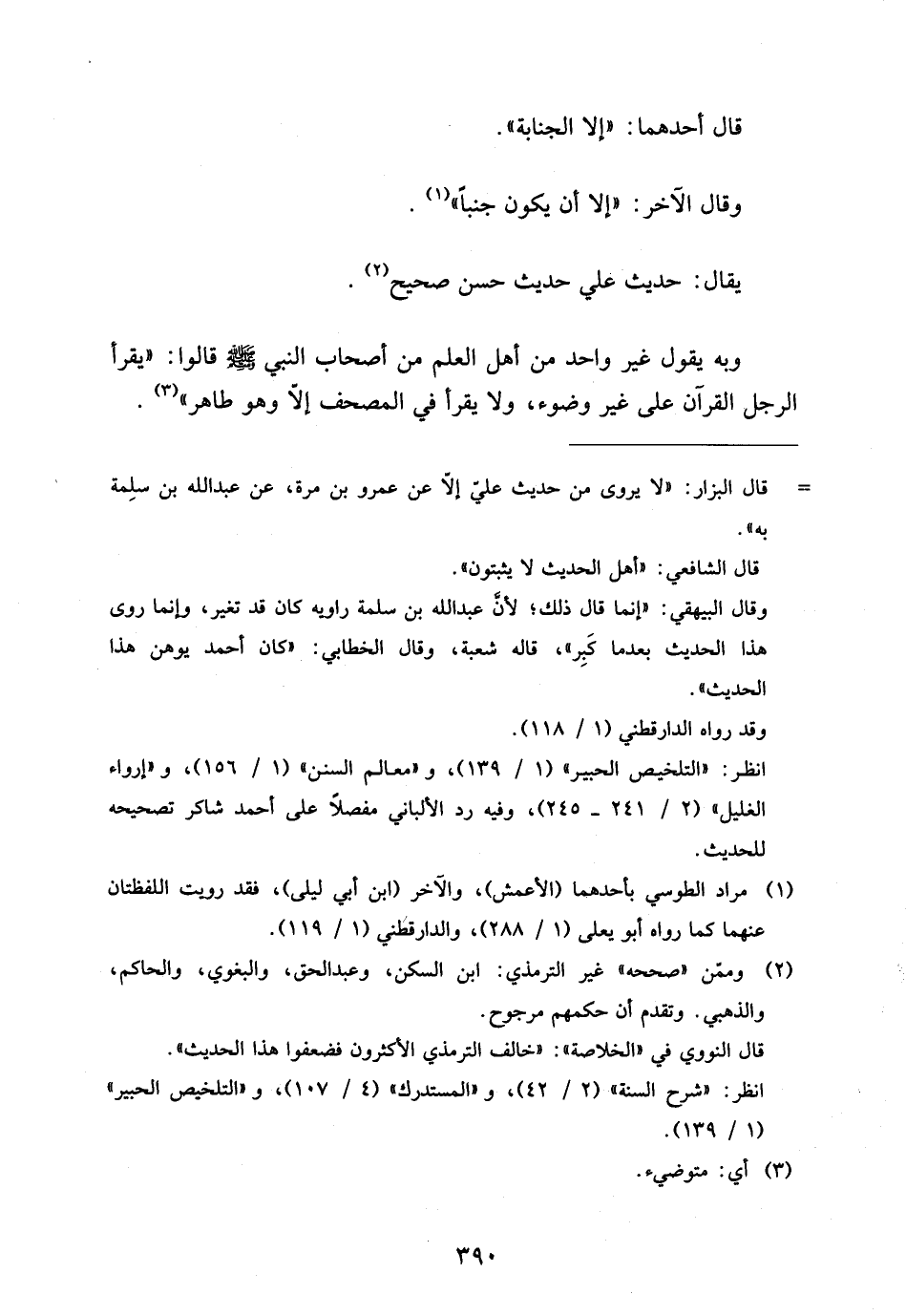 وَبِهِ يَقُولُ غَيْرُ وَاحِدٍ مِنْ أَهْلِ الْعِلْمِ مِنْ أَصْحَابِ النَّبِيِّ صَلَّى اللَّهُ عَلَيْهِ وَسَلَّمَ قَالُوا يَقْرَأُ الرَّجُلُ الْقُرْآنَ عَلَى غَيْرِ وُضُوءٍ وَلا يَقْرَأُ فِي الْمُصْحَفِ إِلا وَهُوَ طَاهِر