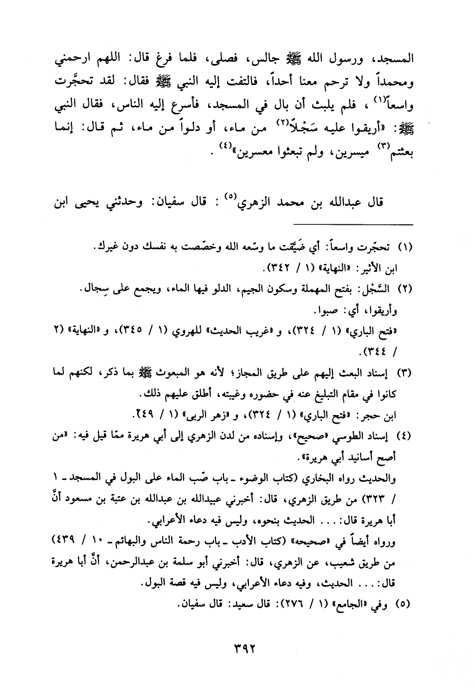 الْمَسْجِدَ وَرَسُولُ اللَّهِ صَلَّى اللَّهُ عَلَيْهِ وَسَلَّمَ جَالِسٌ فَصَلَّى فَلَمَّا فَرَغَ قَالَ اللَّهُمَّ ارْحَمْنِي وَمُحَمَّدًا وَلا تَرْحَمْ مَعَنَا أَحَدًا فَالْتَفَتَ إِلَيْهِ النَّبِيُّ صَلَّى اللَّهُ عَلَيْهِ وَسَلَّمَ فَقَالَ لَقَدْ تَحَجَّرْتَ وَاسِعًا فَلَمْ يَلْبَثْ أَنْ بَالَ فِي الْمَسْجِدِ فَأَسْرَعَ إِلَيْهِ النَّاسُ فَقَالَ النَّبِيُّ صَلَّى اللَّهُ عَلَيْهِ وَسَلَّمَ أَرِيقُوا عَلَيْهِ سِجِلا مِنْ مَاءٍ أَوْ دَلْوًا مِنْ مَاءٍ ثُمَّ قَالَ إِنَّمَا بُعِثْتُمْ مُيَسِّرِينَ وَلَمْ تُبْعَثُوا مُعَسِّرِينَ