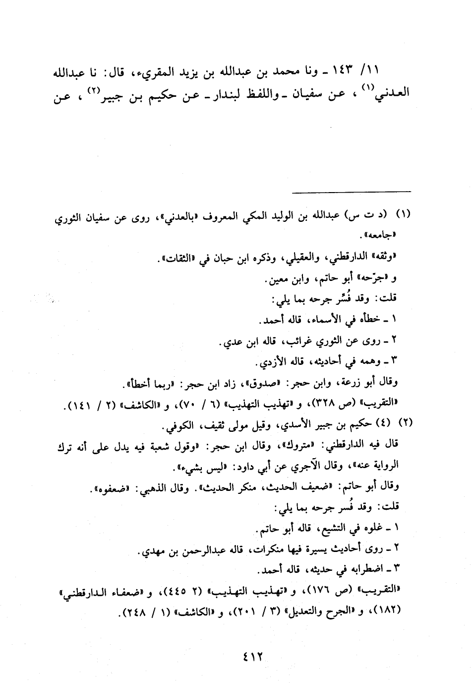 11 - / 143 وَنا مُحَمَّدُ بْنُ عَبْدِ اللَّهِ بْنِ يَزِيدَ المقريء قَالَ نَا عَبْدُ اللَّهِ الْعَدَنِيُّ عَنْ سُفْيَانَ وَاللَّفْظُ لِبُنْدَارٍ عَنْ حَكِيمِ بْنِ جُبَيْرٍ عَنْ