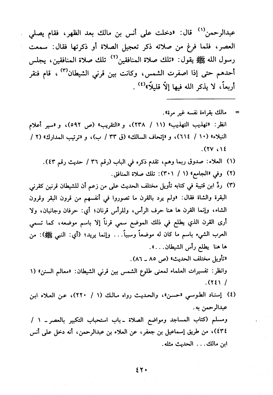 عَبْدِ الرَّحْمَنِ قَالَ دَخَلْتُ عَلَى أَنَسِ بْنِ مَالِكٍ بَعْدَ الظُّهْرِ فَقَامَ يُصَلِّي الْعَصْرَ فَلَمَّا فَرَغَ مِنْ صَلاتِهِ ذَكَرَ تَعْجِيلَ الصَّلاةِ أَوْ ذَكَرْتُهَا فَقَالَ سَمِعْتُ رَسُولَ اللَّهِ صَلَّى اللَّهُ عَلَيْهِ وَسَلَّمَ يَقُولُ تِلْكَ صَلاةُ الْمُنَافِقِينَ تِلْكَ صَلاةُ الْمُنَافِقِينَ يَجْلِسُ أَحَدُهُمْ حَتَّى إِذَا اصْفَرَّتِ الشَّمْسُ وَكَانَتْ بَيْنَ قَرْنَيِ الشَّيْطَانِ قَامَ فَنَقَرَ أَرْبَعًا لَا يَذْكُرُ اللَّهَ فِيهَا إِلا قَلِيلا