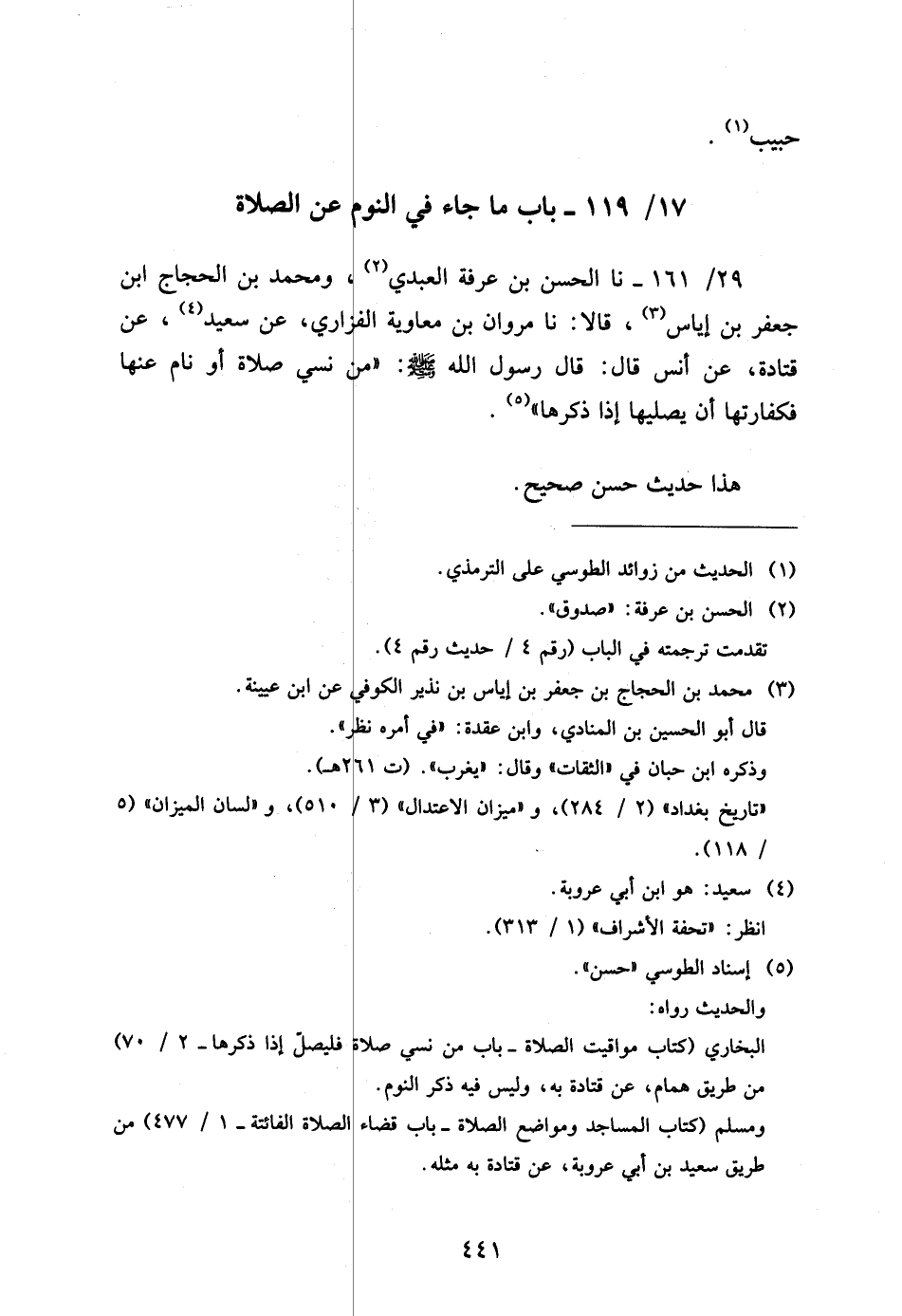 161 - / 29 نَا الْحَسَنُ بْنُ عَرَفَةَ الْعَبْدِيُّ وَمُحَمّد بن الْحجَّاج ابْن جَعْفَرِ بْنِ إِيَاسٍ قَالا نَا مَرْوَانُ بْنُ مُعَاوِيَةَ الْفَزَارِيُّ عَنْ سَعِيدٍ عَنْ قَتَادَةَ عَنْ أَنَسٍ قَالَ قَالَ رَسُولُ اللَّهِ صَلَّى اللَّهُ عَلَيْهِ وَسَلَّمَ مَنْ نَسِيَ صَلاةً أَوْ نَامَ عَنْهَا فَكَفَّارَتُهَا أَنْ يُصَلِّيَها إِذَا ذَكَرَهَا