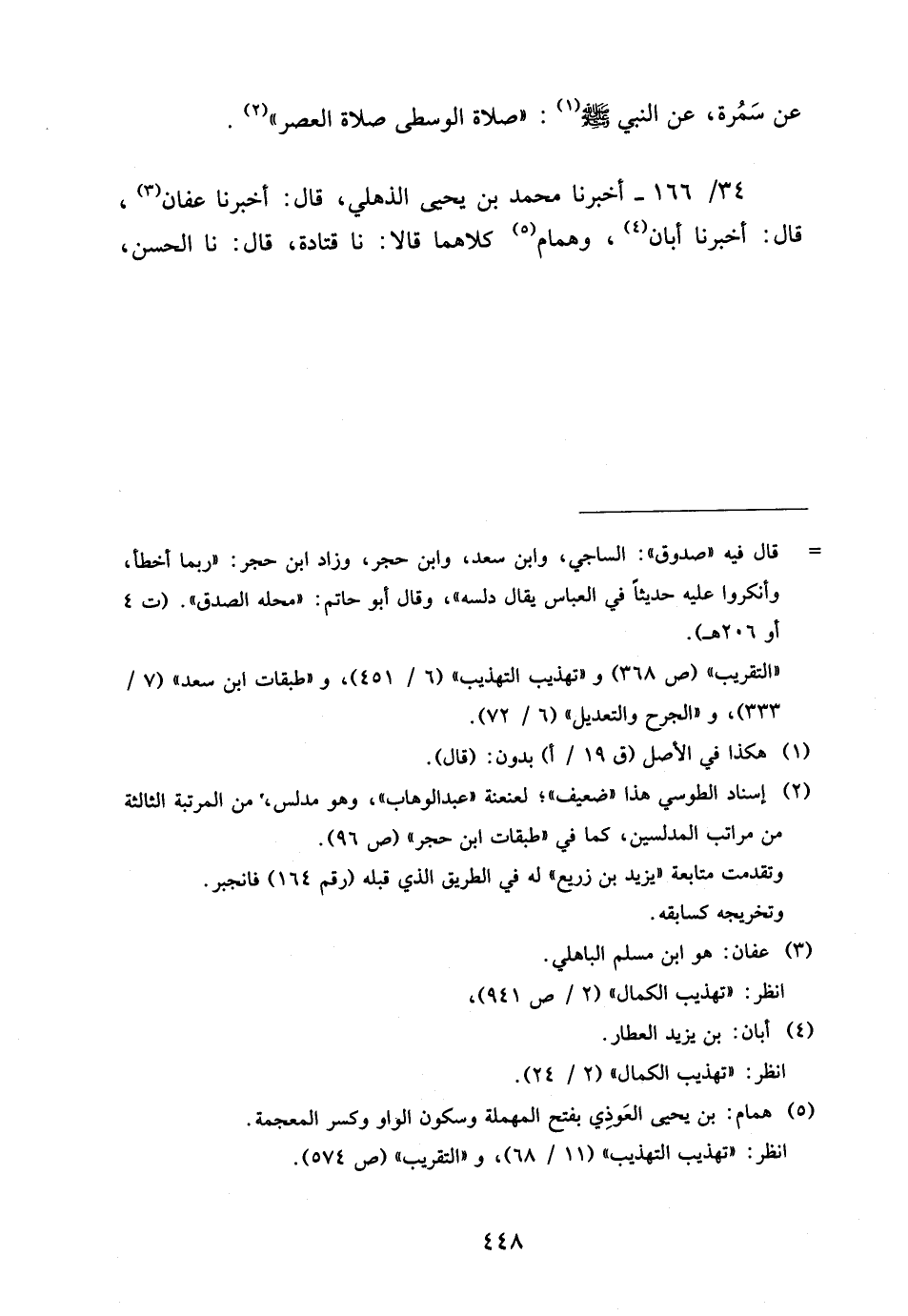 34 - / 166 أَخْبَرَنَا مُحَمَّدُ بْنُ يَحْيَى الذُّهْلِيُّ قَالَ أَخْبَرَنَا عَفَّانُ قَالَ أَخْبَرَنَا أَبَانٌ وَهَمَّامٌ كِلاهُمَا قَالا نَا قَتَادَةُ قَالَ نَا الْحَسَنُ