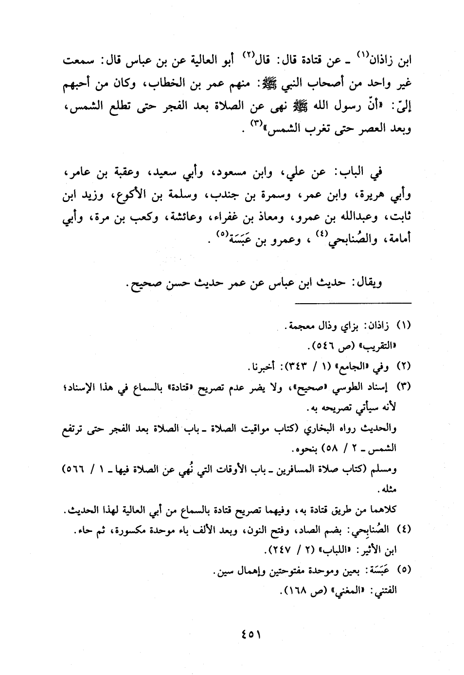 ابْنُ زَاذَانَ عَنْ قَتَادَةَ قَالَ قَالَ أَبُو الْعَالِيَة عَن بن عَبَّاسٍ قَالَ سَمِعْتُ غَيْرَ وَاحِدٍ مِنْ أَصْحَابِ النَّبِيِّ صَلَّى اللَّهُ عَلَيْهِ وَسَلَّمَ مِنْهُمْ عُمَرُ بْنُ الْخَطَّابِ وَكَانَ مِنْ أَحَبِّهِمْ إِلَيَّ أَنَّ رَسُولَ اللَّهِ صَلَّى اللَّهُ عَلَيْهِ وَسَلَّمَ نَهَى عَنِ الصَّلاةِ بَعْدَ الْفَجْرِ حَتَّى تَطْلُعَ الشَّمْسُ وَبَعْدَ الْعَصْرِ حَتَّى تَغْرُبَ الشَّمْسُ