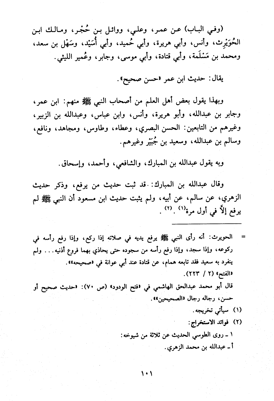 وَقَالَ عَبْدُ اللَّهِ بْنُ الْمُبَارَكِ قَدْ ثَبَتَ حَدِيثُ مَنْ يَرْفَعُ وَذَكَرَ حَدِيثَ الزُّهْرِيِّ عَنْ سَالِمٍ عَنْ أَبِيهِ وَلَمْ يُثْبِتْ حَدِيثَ ابْنِ مَسْعُودٍ أَنَّ النَّبِيَّ صَلَّى اللَّهُ عَلَيْهِ وَسَلَّمَ لَمْ يَرْفَعْ إِلا فِي أَوَّلِ مَرَّةً