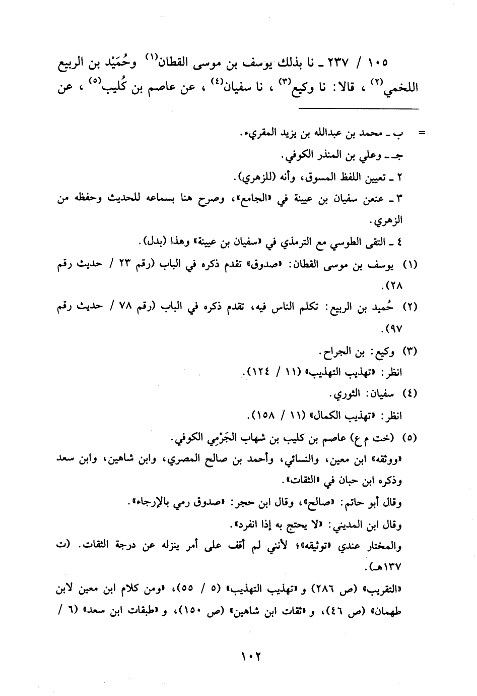 105 - / 237 نَا بِذَلِكَ يُوسُفُ بْنُ مُوسَى الْقَطَّانُ وَحُمَيْدُ بْنُ الرَّبِيعِ اللَّخْمِيُّ قَالا نَا وَكِيعٌ نَا سُفْيَانُ عَنْ عَاصِمِ بْنِ كُلَيْبٍ عَنْ