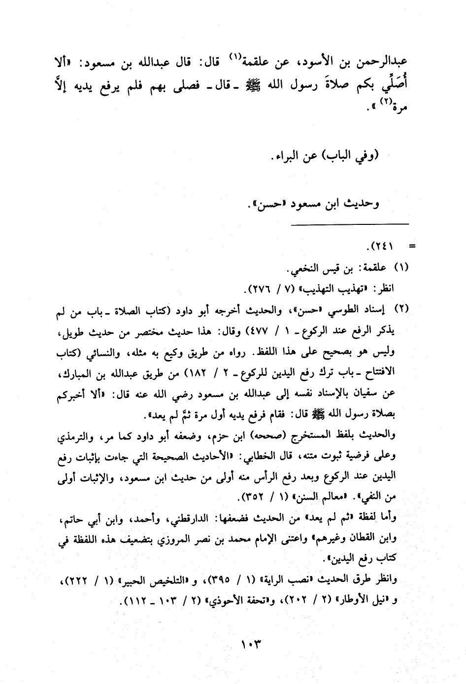 عَبْدِ الرَّحْمَنِ بْنِ الأَسْوَدِ عَنْ عَلْقَمَةَ قَالَ قَالَ عَبْدُ اللَّهِ بْنُ مَسْعُودٍ أَلا أُصَلِّي بِكُمْ صَلاةَ رَسُولِ اللَّهِ صَلَّى اللَّهُ عَلَيْهِ وَسَلَّمَ قَالَ فَصَلَّى بِهِمْ فَلَمْ يَرْفَعْ يَدَيْهِ إِلا مَرَّةً