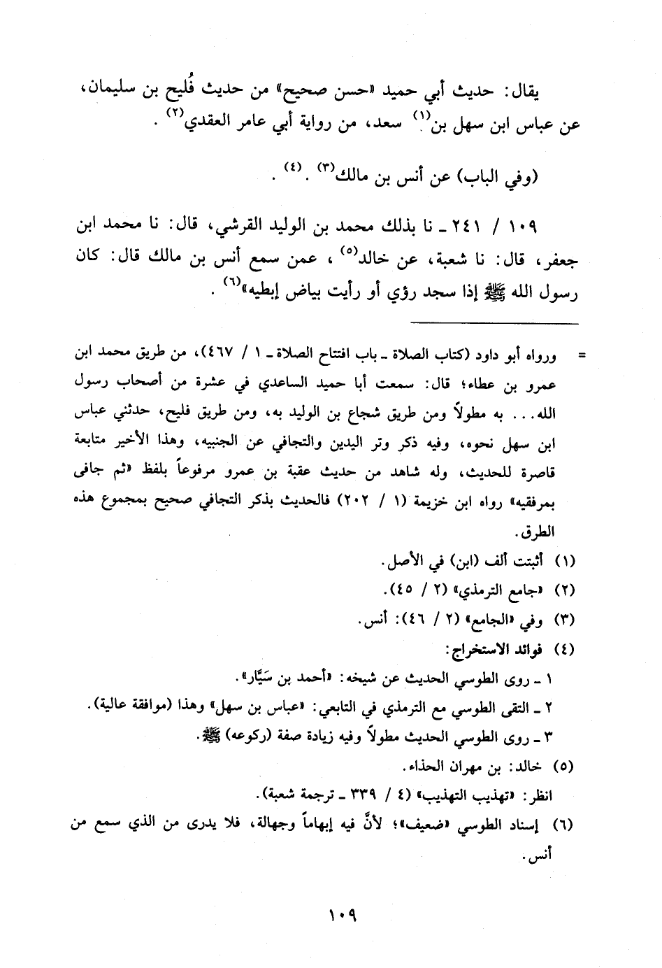 109 - / 241 نَا بِذَلِكَ مُحَمَّدُ بْنُ الْوَلِيدِ الْقُرَشِيُّ قَالَ نَا مُحَمَّد ابْن جَعْفَرٍ قَالَ نَا شُعْبَةُ عَنْ خَالِدٍ عَمَّنْ سَمِعَ أَنَسَ بْنَ مَالِكٍ قَالَ كَانَ رَسُولُ اللَّهِ صَلَّى اللَّهُ عَلَيْهِ وَسَلَّمَ إِذَا سَجَدَ رُؤِيَ أَوْ رَأَيْتُ بَيَاضَ إِبِطَيْهِ