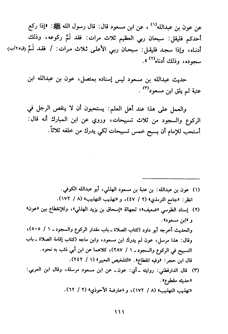عَنْ عَوْنِ بْنِ عَبْدِ اللَّهِ عَنِ ابْنِ مَسْعُودٍ قَالَ قَالَ رَسُولُ اللَّهِ صَلَّى اللَّهُ عَلَيْهِ وَسَلَّمَ إِذَا رَكَعَ أَحَدُكُمْ فَلْيَقُلْ سُبْحَانَ رَبِّيَ الْعَظِيمِ ثَلاثَ مَرَّاتٍ فَقَدْ تَمَّ رُكُوعُهُ وَذَلِكَ أَدْنَاهُ وَإِذَا سَجَدَ فَلْيَقُلْ سُبْحَانَ رَبِّيَ الأَعْلَى ثَلاثَ مَرَّاتٍ فَقَدْ تَمَّ سُجُودُهُ وَذَلِكَ أَدْنَاهُ
