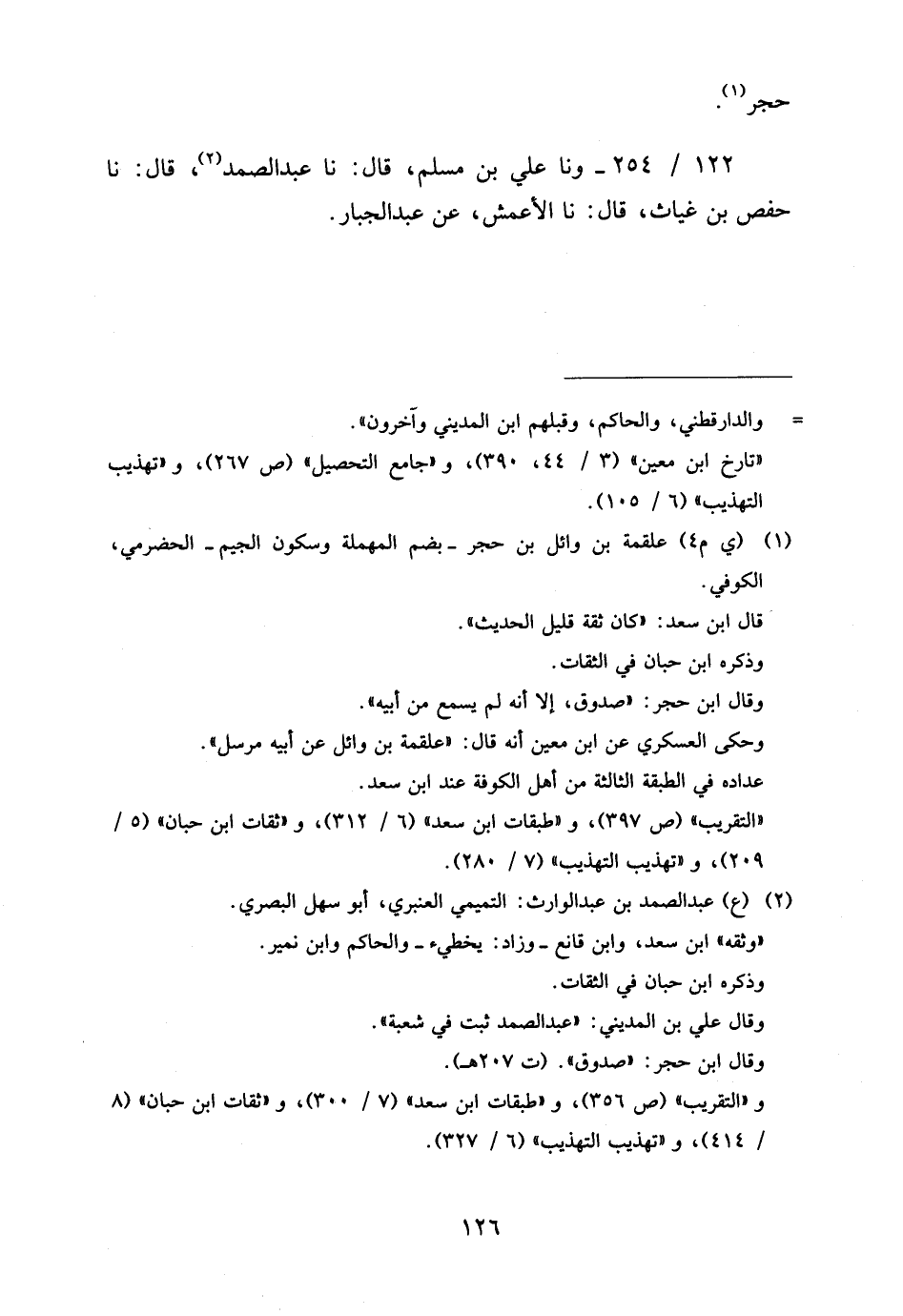 122 - / 254 وَنا عَلِيُّ بْنُ مُسْلِمٍ قَالَ نَا عَبْدُ الصَّمَدِ قَالَ نَا حَفْصُ بْنُ غِيَاثٍ قَالَ نَا الأَعْمَشُ عَنْ عَبْدِ الْجَبَّارِ