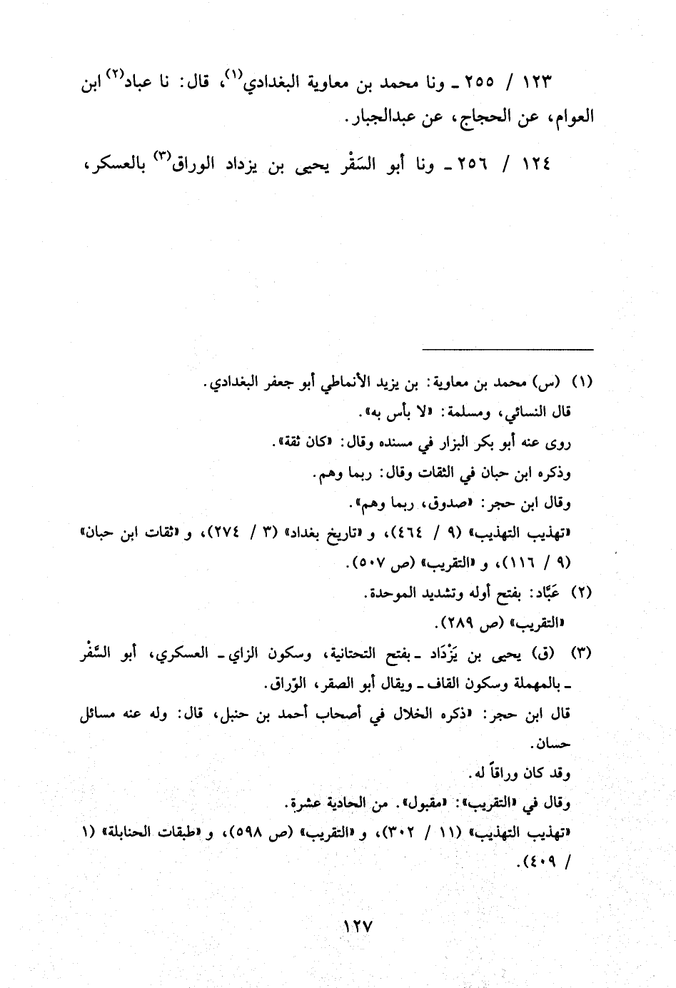 123 - / 255 وَنا مُحَمَّدُ بْنُ مُعَاوِيَةَ الْبَغْدَادِيُّ قَالَ نَا عباد ابْن الْعَوَّامِ عَنِ الْحَجَّاجِ عَنْ عَبْدِ الْجَبَّارِ