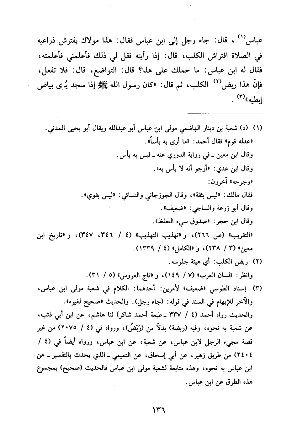 عَبَّاسٍ قَالَ جَاءَ رَجُلٌ إِلَى ابْنِ عَبَّاسٍ فَقَالَ هَذَا مَوْلاكَ يَفْتَرِشُ ذِرَاعَيْهِ فِي الصَّلاةِ افْتِرَاشَ الْكَلْبِ قَالَ إِذَا رَأَيْتَهُ فَقُلْ لِي ذَلِكَ فَأَعْلِمْنِي فَأَعْلَمْتُهُ فَقَالَ لَهُ ابْنُ عَبَّاسٍ مَا حَمَلَكَ عَلَى هَذَا قَالَ التَّوَاضُعُ قَالَ فَلا تَفْعَلْ فَإِنَّ هَذَا رَبَضُ الْكَلْبِ ثُمَّ قَالَ كَانَ رَسُولُ اللَّهِ صَلَّى اللَّهُ عَلَيْهِ وَسَلَّمَ إِذَا سَجَدَ يُرَى بَيَاضُ إِبِطَيْهِ
