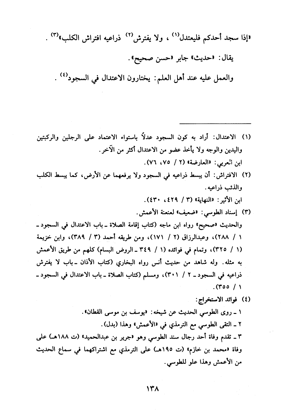 وَالْعَمَل عَلَيْهِ عِنْدَ أَهْلِ الْعِلْمِ يَخْتَارُونَ الاعْتِدَالَ فِي السُّجُودِ