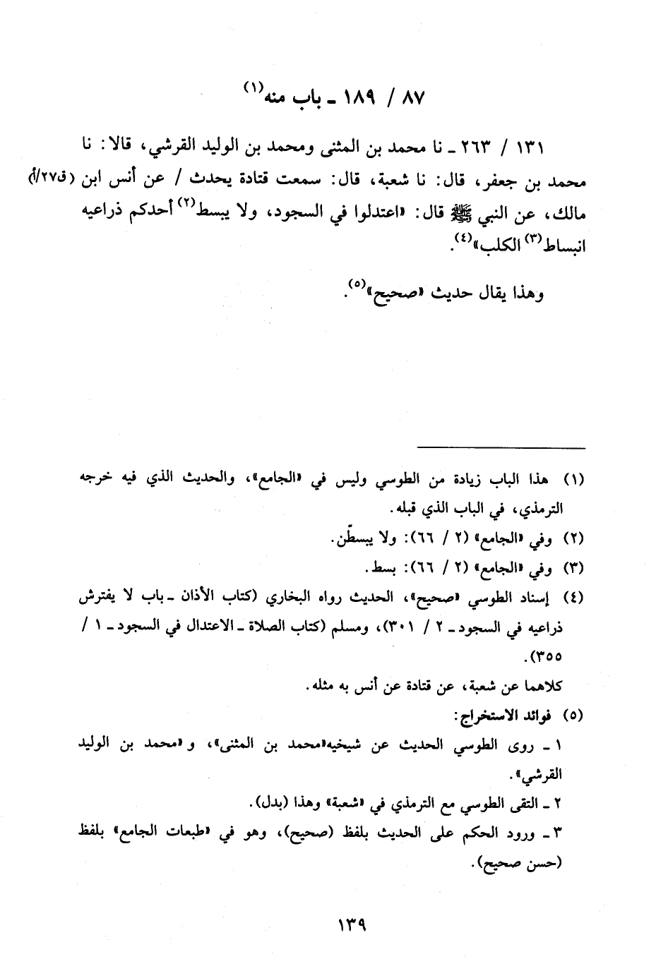 131 - / 263 نَا مُحَمَّدُ بْنُ الْمُثَنَّى وَمُحَمَّدُ بْنُ الْوَلِيدِ الْقُرَشِيُّ قَالا نَا مُحَمَّدُ بْنُ جَعْفَرٍ قَالَ نَا شُعْبَةُ قَالَ سَمِعْتُ قَتَادَةَ يحدث عَن أنس ابْن مَالِكٍ عَنِ النَّبِيِّ صَلَّى اللَّهُ عَلَيْهِ وَسَلَّمَ قَالَ اعْتَدِلُوا فِي السُّجُودِ وَلا يَبْسُطْ أَحَدُكُمْ ذِرَاعَيْهِ انْبِسَاطَ الْكَلْبِ