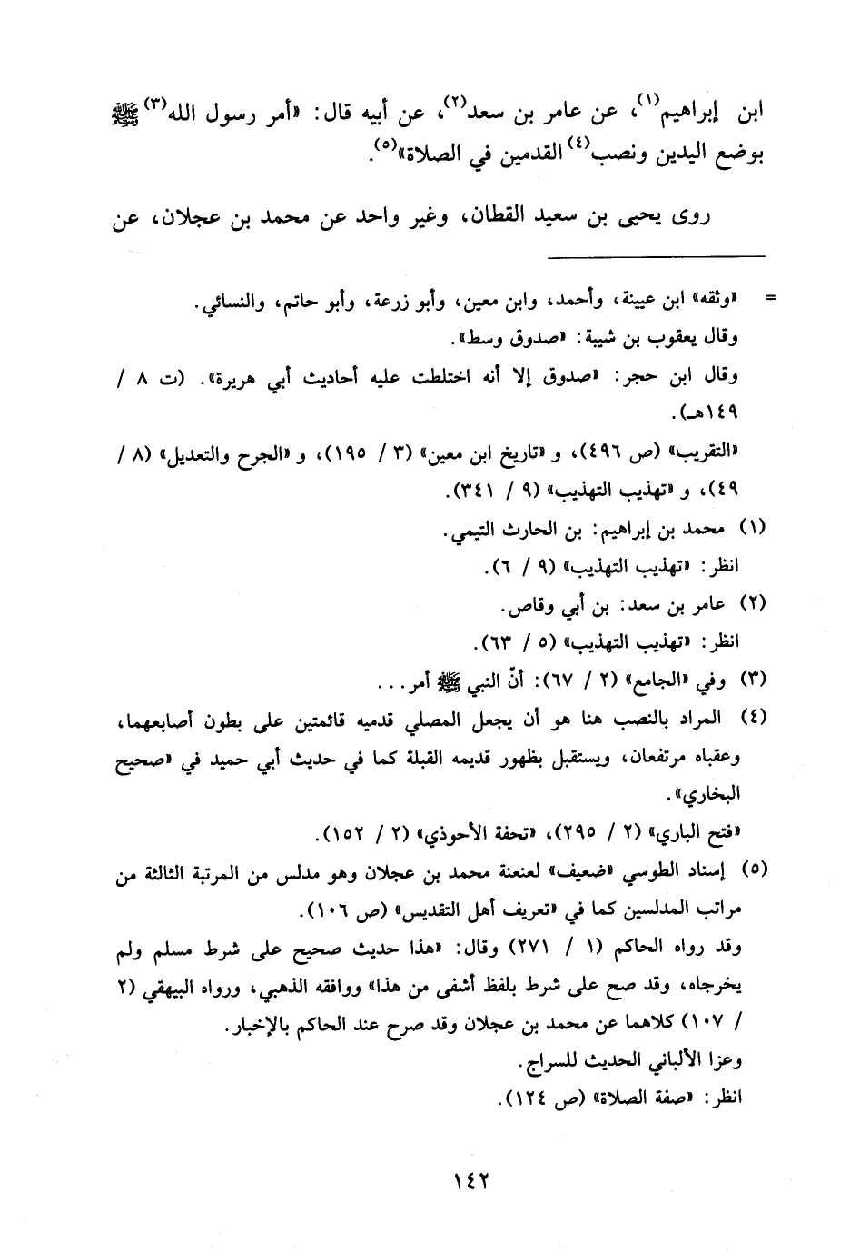 ابْن إِبْرَاهِيمَ عَنْ عَامِرِ بْنِ سَعْدٍ عَنْ أَبِيهِ قَالَ أَمَرَ رَسُولُ اللَّهِ صَلَّى اللَّهُ عَلَيْهِ وَسَلَّمَ بِوَضْعِ الْيَدَيْنِ وَنَصْبِ الْقَدَمَيْنِ فِي الصَّلاةِ