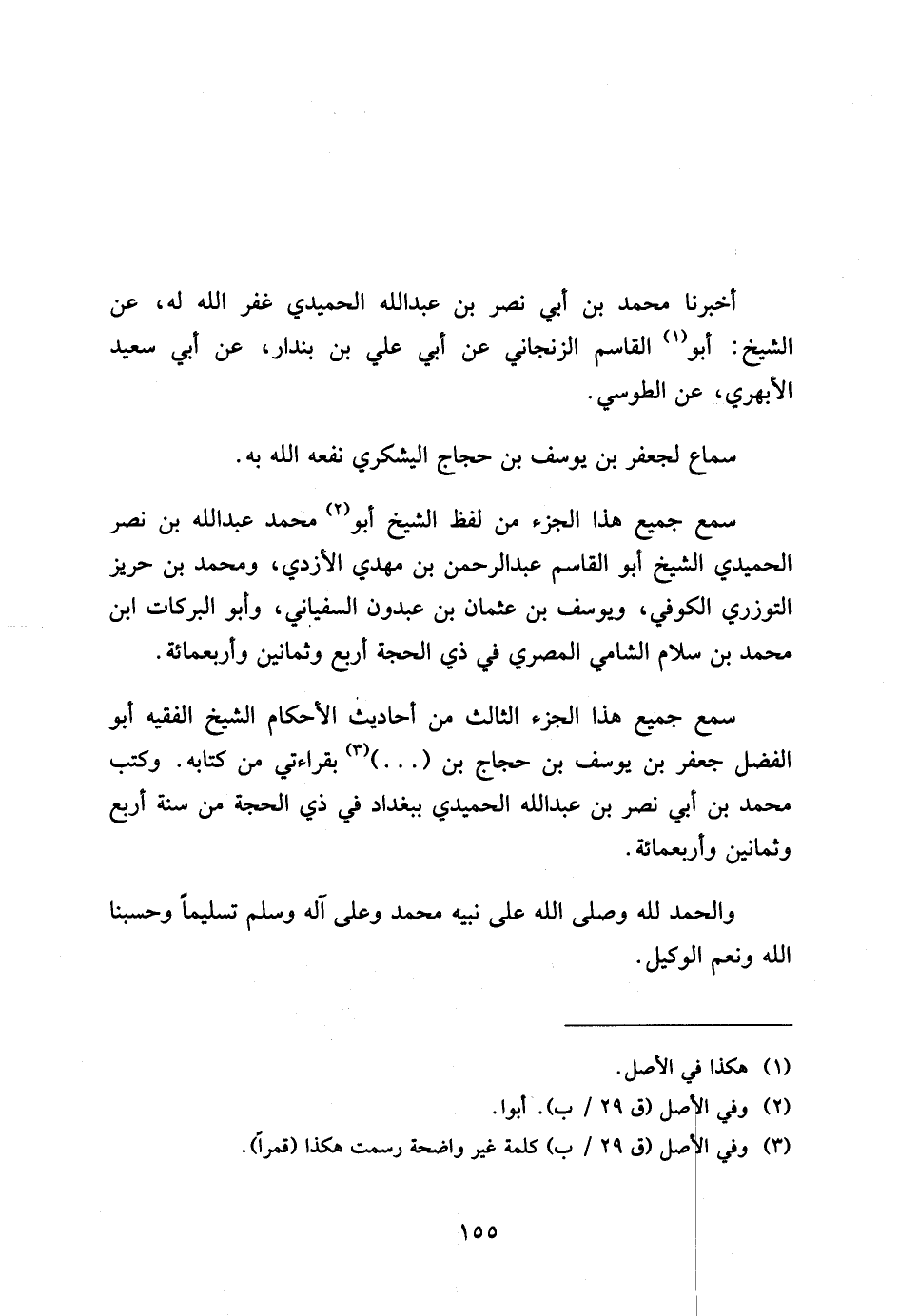 سَمِعَ جَمِيعَ هَذَا الْجُزْءِ الثَّالِثِ مِنْ أَحَادِيثِ الأَحْكَامِ الشَّيْخُ الْفَقِيهُ أَبُو الْفَضْلِ جَعْفَرُ بْنُ يُوسُفَ بْنِ حَجَّاجِ بْنِ بِقِرَاءَتِي مِنْ كِتَابِهِ وَكَتَبَ مُحَمَّدُ بْنُ أَبِي نَصْرِ بْنِ عَبْدِ اللَّهِ الْحُمَيْدِيُّ بِبَغْدَادَ فِي ذِي الْحَجَّةِ مِنْ سنة أَربع وَثَمَانِينَ وَأَرْبَعمِائَة