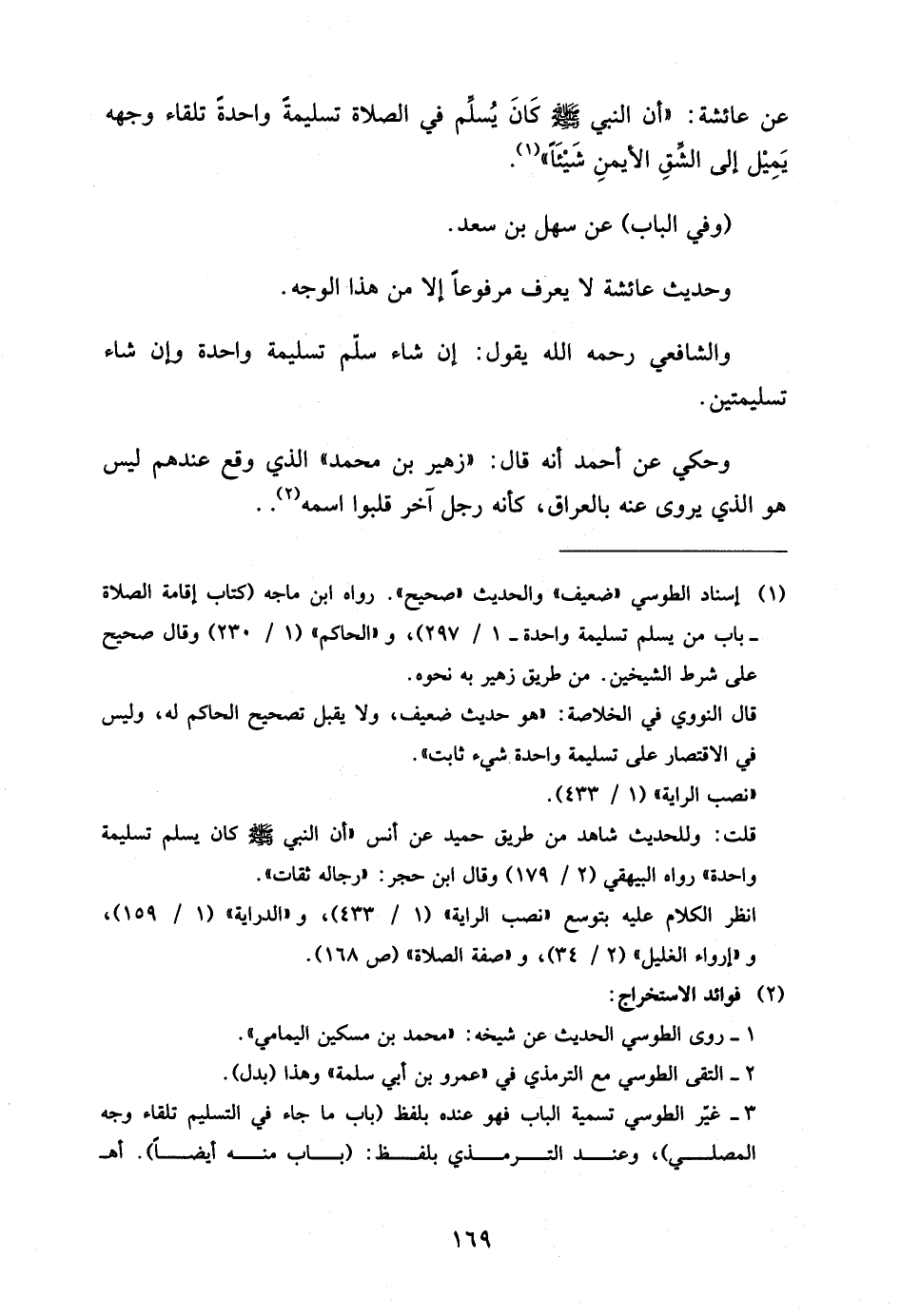 عَنْ عَائِشَةَ أَنَّ النَّبِيَّ صَلَّى اللَّهُ عَلَيْهِ وَسَلَّمَ كَانَ يُسَلِّمُ فِي الصَّلاةِ تَسْلِيمَةً وَاحِدَةً تِلْقَاءَ وَجْهِهِ يَمِيلُ إِلَى الشِّقِّ الأَيْمَنِ شَيْئًا
