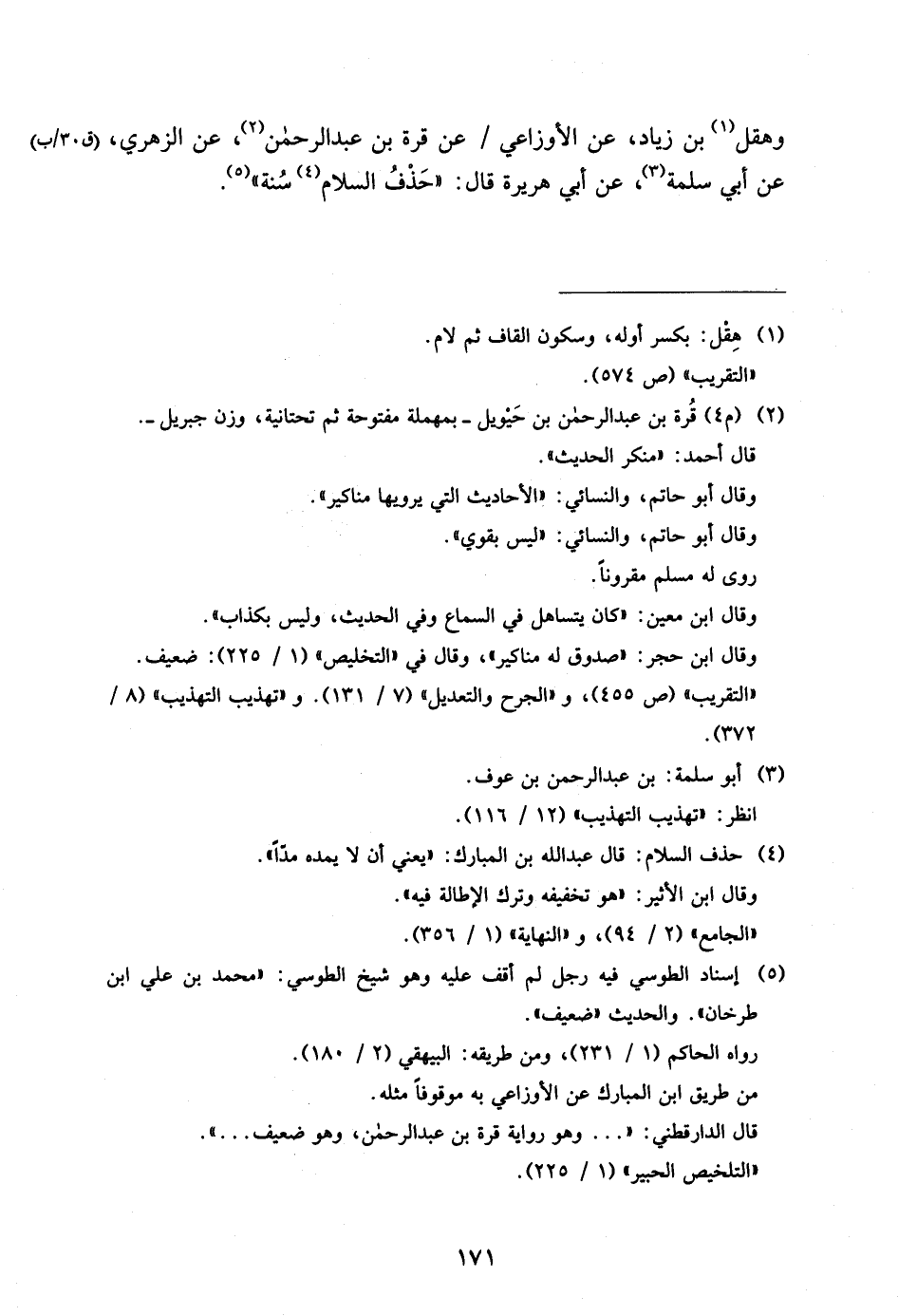 وَهِقْلُ بْنُ زِيَادٍ عَنِ الأَوْزَاعِيِّ عَنْ قُرَّةَ بْنِ عَبْدِ الرَّحْمَنِ عَنِ الزُّهْرِيِّ عَنْ أَبِي سَلَمَةَ عَنْ أَبِي هُرَيْرَةَ قَالَ حَذْفُ السَّلامِ سنة