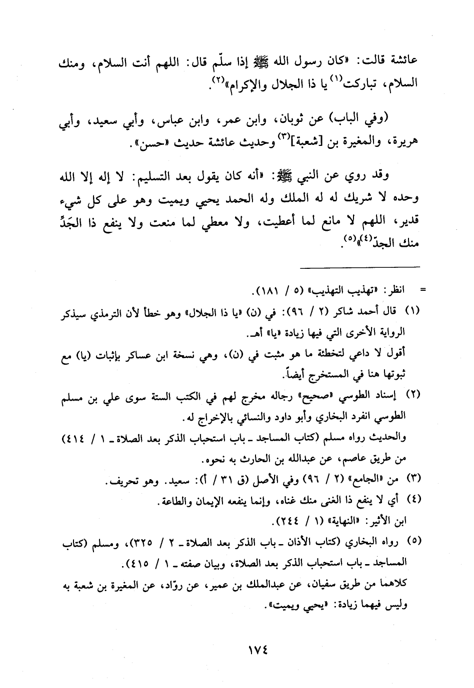 عَائِشَةَ قَالَتْ كَانَ رَسُولُ اللَّهِ صَلَّى اللَّهُ عَلَيْهِ وَسَلَّمَ إِذَا سَلَّمَ قَالَ اللَّهُمَّ أَنْتَ السَّلامُ وَمِنْكَ السَّلامُ تَبَارَكْتَ يَا ذَا الْجَلالِ وَالإِكْرَامِ