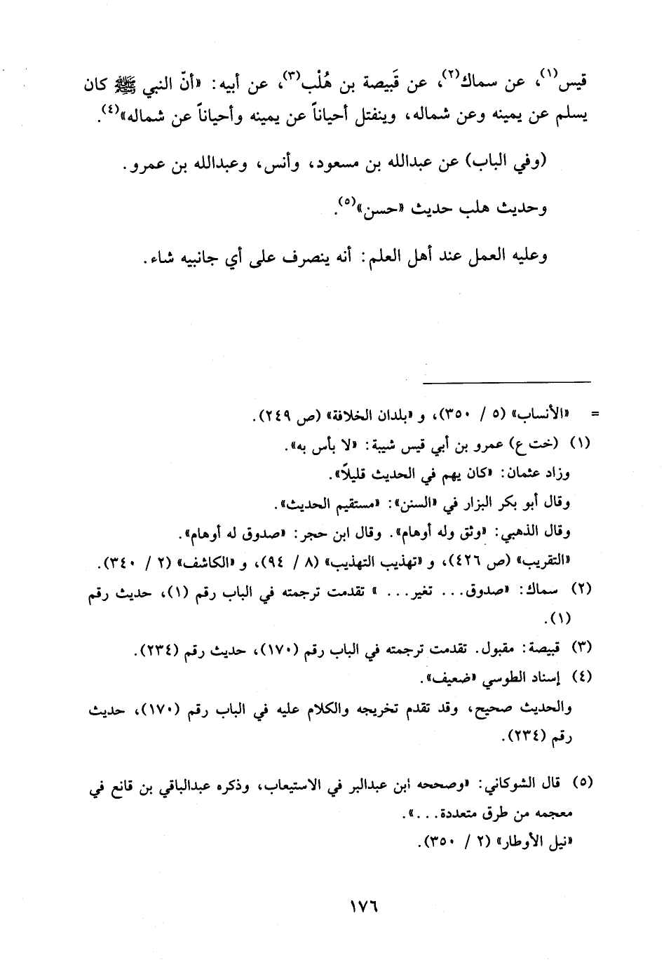 قَيْسٍ عَنْ سِمَاكٍ عَنْ قَبِيصَةَ بْنِ هُلْبٍ عَنْ أَبِيهِ أَنَّ النَّبِيَّ صَلَّى اللَّهُ عَلَيْهِ وَسَلَّمَ كَانَ يُسَلِّمُ عَنْ يَمِينِهِ وَعَنْ شِمَالِهِ وَيَنْفَتِلُ أَحْيَانًا عَنْ يَمِينِهِ وَأَحْيَانًا عَنْ شِمَالِهِ