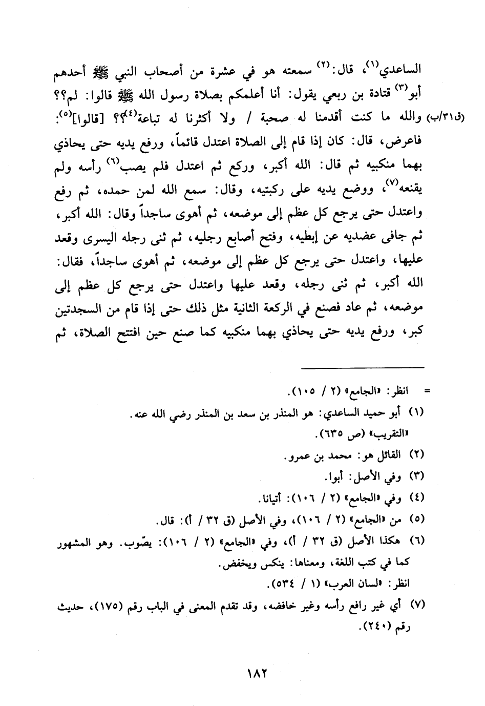 السَّاعِدِيِّ قَالَ سَمِعْتُهُ هُوَ فِي عَشَرَةٍ مِنْ أَصْحَابِ النَّبِيِّ صَلَّى اللَّهُ عَلَيْهِ وَسَلَّمَ أَحَدُهُمْ أَبُو قَتَادَةَ بْنُ رِبْعِيٍّ يَقُولُ أَنَا أَعْلَمُكُمْ بِصَلاةِ رَسُولِ اللَّهِ صَلَّى اللَّهُ عَلَيْهِ وَسَلَّمَ قَالُوا لم وَالله مَا كنت قدمنَا لَهُ صُحْبَةً وَلا أَكْثَرَنَا لَهُ تَبَاعَةً قَالُوا فَاعْرِضْ قَالَ كَانَ إِذَا قَامَ إِلَى الصَّلاةِ اعْتَدَلَ قَائِمًا وَرَفَعَ يَدَيْهِ حَتَّى يُحَاذِيَ بِهِمَا مَنْكِبَيْهِ ثُمَّ قَالَ اللَّهُ أَكْبَرُ وَرَكَعَ ثُمَّ اعْتَدَلَ فَلَمْ يَصُبَّ رَأْسَهُ وَلَمْ يُقْنِعْهُ وَوَضَعَ يَدَيْهِ عَلَى رُكْبَتَيْهِ وَقَالَ سَمِعَ اللَّهُ لِمَنْ حَمِدَهُ ثُمَّ رَفَعَ وَاعْتَدَلَ حَتَّى يَرْجِعَ كُلُّ عَظْمٍ إِلَى مَوْضِعِهِ ثُمَّ أَهْوَى سَاجِدًا وَقَالَ اللَّهُ أَكْبَرُ ثُمَّ جَافَى عَضُدَيْهِ عَنْ إِبِطَيْهِ وَفَتَحَ أَصَابِعَ رِجْلَيْهِ ثُمَّ ثَنَى رِجْلَهُ الْيُسْرَى وَقَعَدَ عَلَيْهَا وَاعْتَدَلَ حَتَّى يَرْجِعَ كُلُّ عَظْمٍ إِلَى مَوْضِعِهِ ثُمَّ أَهْوَى سَاجِدًا فَقَالَ اللَّهُ أَكْبَرُ ثُمَّ ثَنَى رِجْلَهُ وَقَعَدَ عَلَيْهَا وَاعْتَدَلَ حَتَّى يَرْجِعَ كُلُّ عَظْمٍ إِلَى مَوْضِعِهِ ثُمَّ عَادَ فَصَنَعَ فِي الرَّكْعَةِ الثَّانِيَةِ مِثْلَ ذَلِكَ حَتَّى إِذَا قَامَ مِنَ السَّجْدَتَيْنِ كَبَّرَ وَرَفَعَ يَدَيْهِ حَتَّى يُحَاذِيَ بِهِمَا مَنْكِبَيْهِ كَمَا صَنَعَ حِينَ افْتَتَحَ الصَّلاةَ ثُمَّ