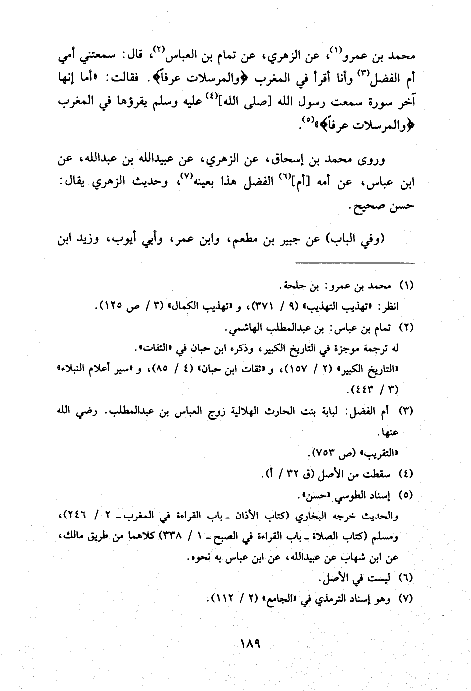 مُحَمَّدِ بْنِ عَمْرٍو عَنِ الزُّهْرِيِّ عَنْ تَمَّامِ بْنِ الْعَبَّاسِ قَالَ سَمِعَتْنِي أُمِّي أُمُّ الْفَضْلِ وَأَنَا أَقْرَأُ فِي الْمَغْرِبِ {وَالْمُرْسَلاتِ عُرْفًا} فَقَالَتْ أَمَا إِنَّهَا آخِرُ سُورَةٍ سَمِعْتُ رَسُولَ اللَّهِ صَلَّى اللَّهُ عَلَيْهِ وَسَلَّمَ يَقْرَؤُهَا فِي الْمَغْرِبِ {وَالْمُرْسَلاتِ عُرْفًا}