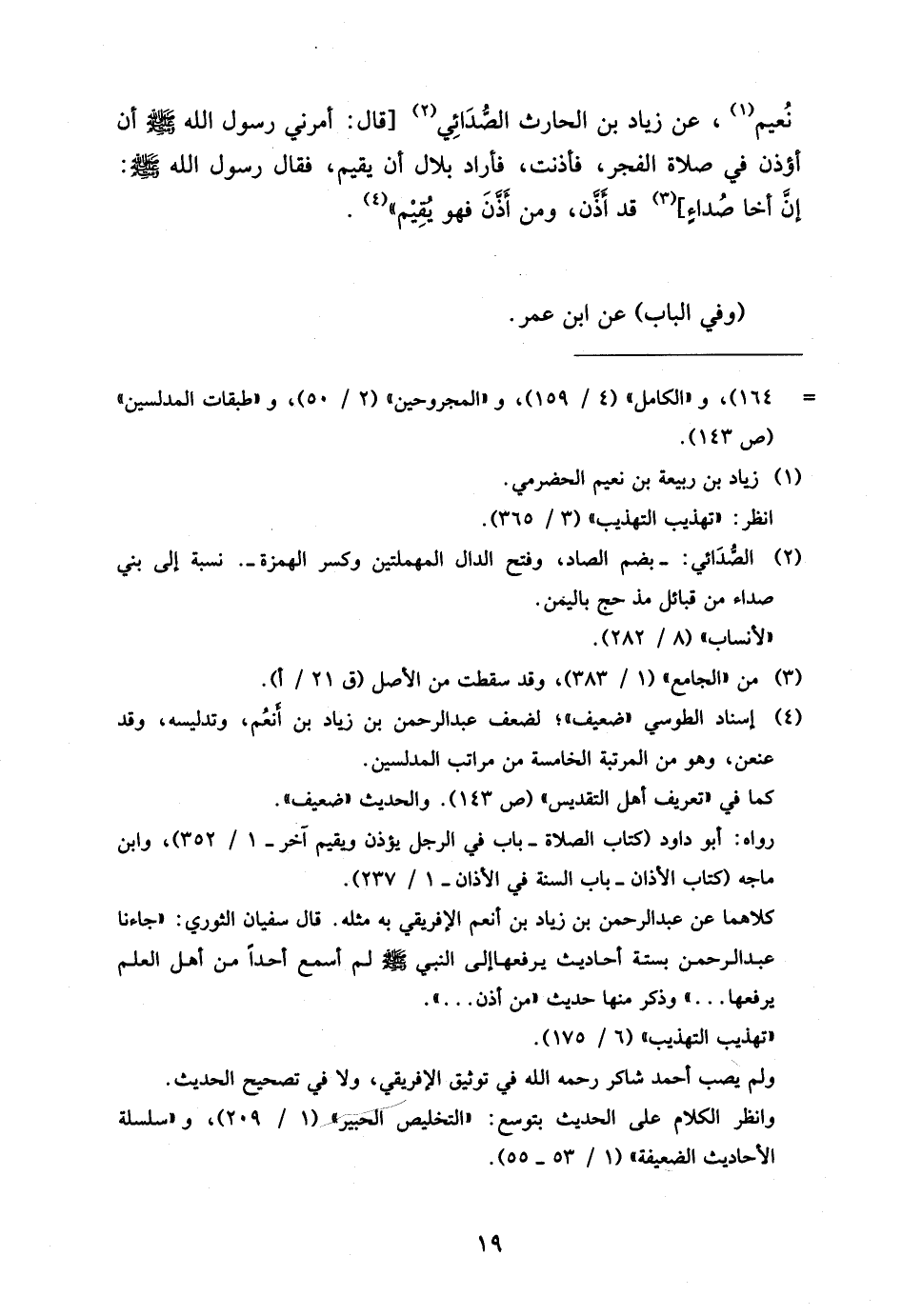 نُعَيْمٍ عَنْ زِيَادِ بْنِ الْحَارِثِ الصُّدَائِيِّ قَالَ أَمَرَنِي رَسُولُ اللَّهِ صَلَّى اللَّهُ عَلَيْهِ وَسَلَّمَ أَنْ أُؤَذِّنَ فِي صَلاةِ الْفَجْرِ فَأَذَّنْتُ فَأَرَادَ بِلالٌ أَنْ يُقِيمَ فَقَالَ رَسُولُ اللَّهِ صَلَّى اللَّهُ عَلَيْهِ وَسَلَّمَ إِنَّ أَخَا صُدَاءٍ قَدْ أَذَّنَ وَمَنْ أَذَّنَ فَهُوَ يُقِيمُ