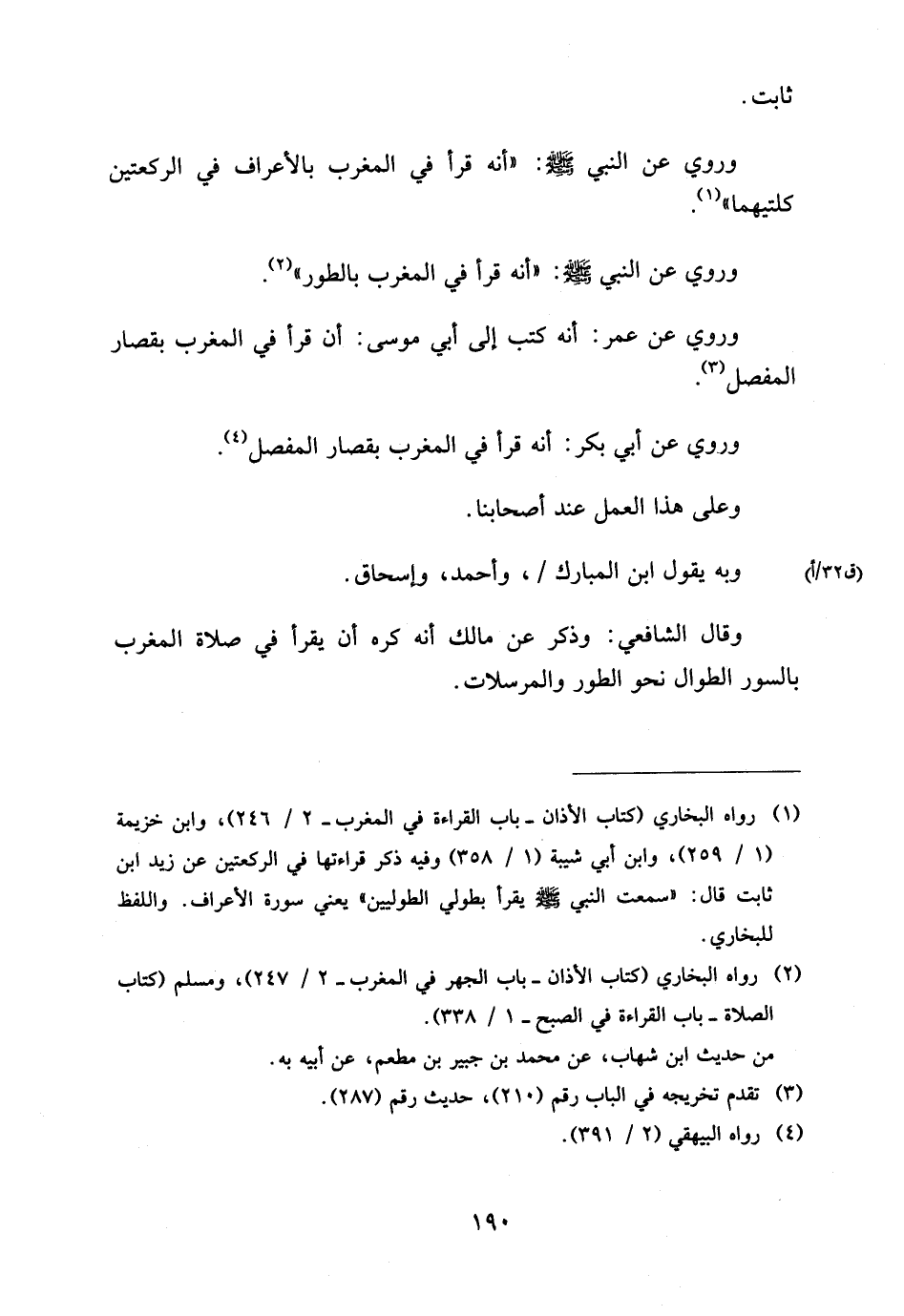 وَرُوِيَ عَنِ النَّبِيِّ صَلَّى اللَّهُ عَلَيْهِ وَسَلَّمَ أَنَّهُ قَرَأَ فِي الْمَغْرِبِ بِالأَعْرَافِ فِي الرَّكْعَتَيْنِ كِلْتَيْهِمَا