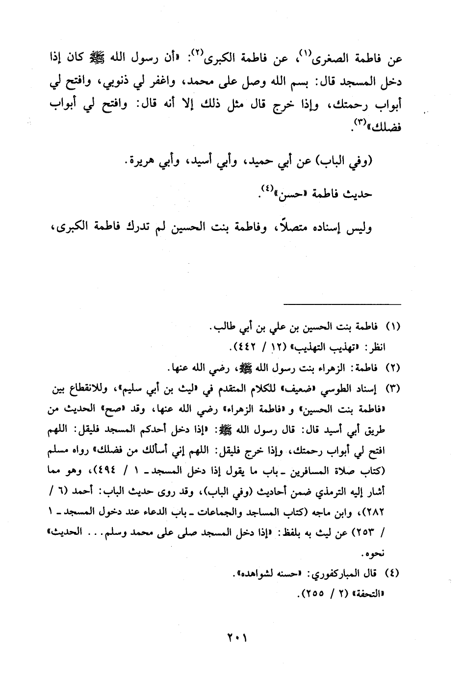 عَنْ فَاطِمَةَ الصُّغْرَى عَنْ فَاطِمَةَ الْكُبْرَى أَنَّ رَسُولَ اللَّهِ صَلَّى اللَّهُ عَلَيْهِ وَسَلَّمَ كَانَ إِذَا دَخَلَ الْمَسْجِدَ قَالَ بِسْمِ اللَّهِ وَصَلِّ عَلَى مُحَمَّدٍ وَاغْفِرْ لِي ذُنُوبِي وَافْتَحْ لِي أَبْوَابَ رَحْمَتِكَ وَإِذَا خَرَجَ قَالَ مِثْلَ ذَلِكَ إِلا أَنَّهُ قَالَ وَافْتَحْ لِي أَبْوَابَ فَضْلِكَ