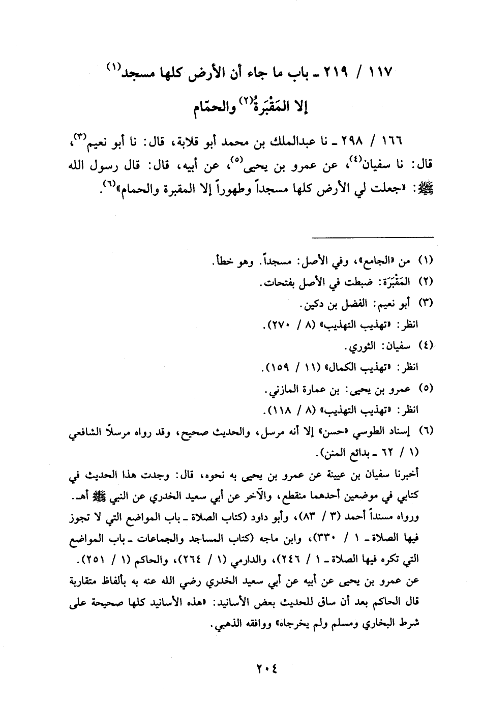 117 - / 219 بَابُ مَا جَاءَ أَنَّ الأَرْضَ كُلَّهَا مَسْجِدٌ إِلا الْمَقْبَرَةَ وَالْحَمَّامَ