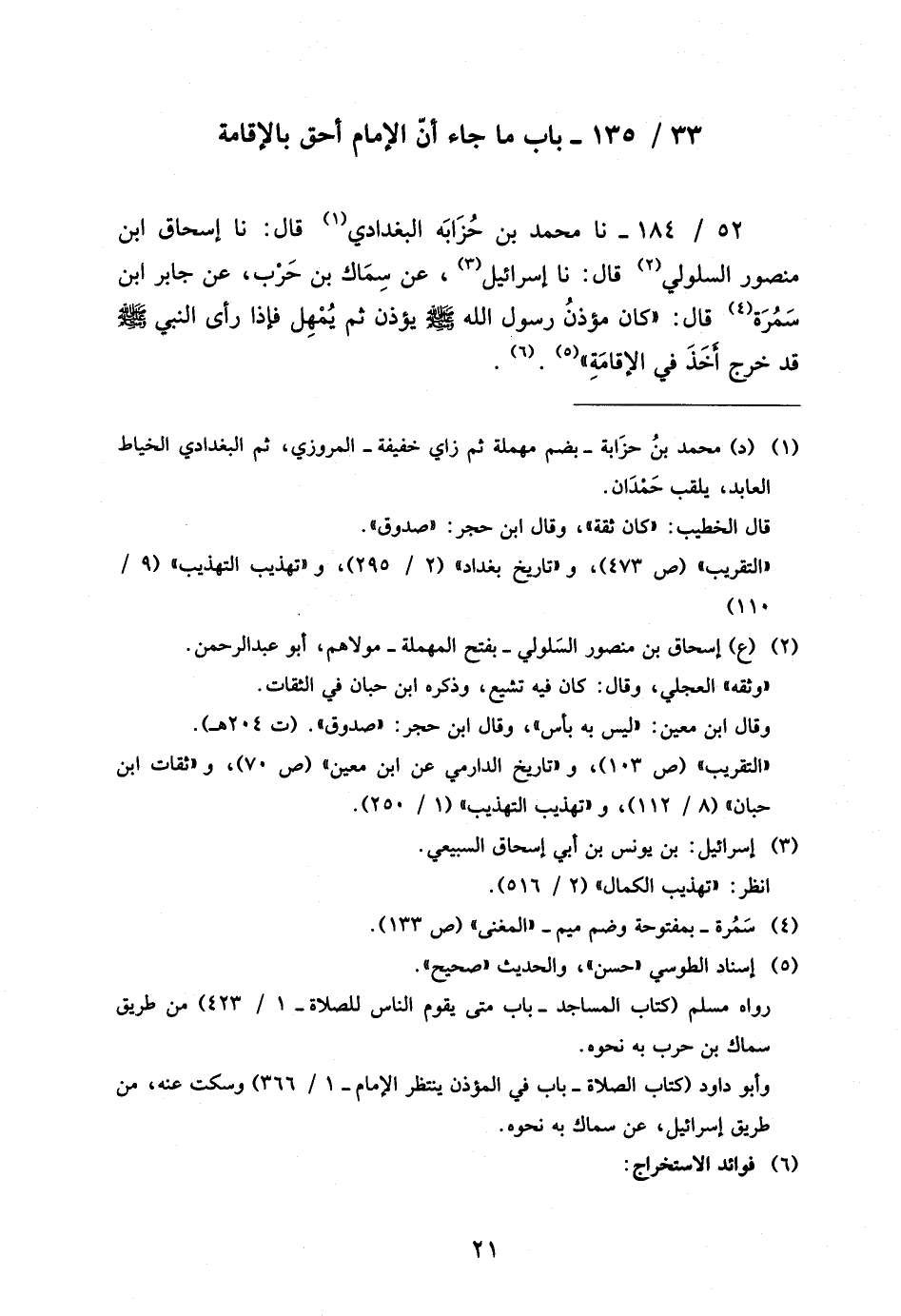 52 - / 184 نَا مُحَمَّدُ بْنُ حُزَابَةَ الْبَغْدَادِيُّ قَالَ نَا إِسْحَاق ابْن مَنْصُورٍ السَّلُولِيُّ قَالَ نَا إِسْرَائِيلُ عَنْ سِمَاكِ بن حَرْب عَن جَابر ابْن سَمُرَةَ قَالَ كَانَ مُؤَذِّنُ رَسُولِ اللَّهِ صَلَّى اللَّهُ عَلَيْهِ وَسَلَّمَ يُؤَذِّنُ ثُمَّ يُمْهِلُ فَإِذَا رَأَى النَّبِيَّ صَلَّى اللَّهُ عَلَيْهِ وَسَلَّمَ قَدْ خَرَجَ أَخَذَ فِي الإِقَامَةِ