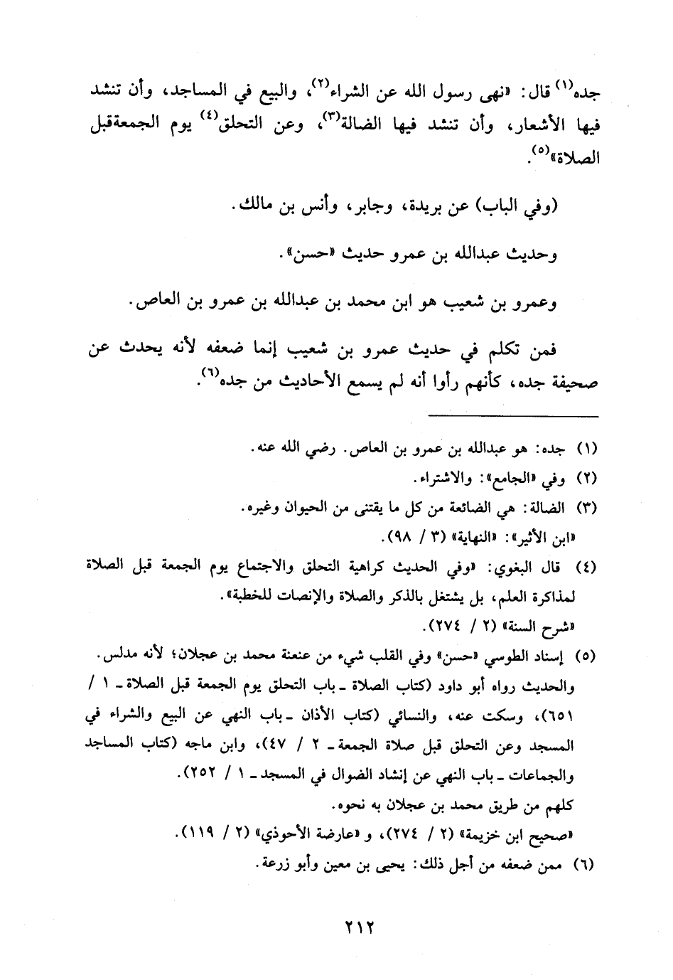 فَمَنْ تَكَلَّمَ فِي حَدِيثِ عَمْرِو بْنِ شُعَيْبٍ إِنَّمَا ضَعَّفَهُ لأَنَّهُ يُحَدِّثُ عَنْ صَحِيفَةِ جَدِّهِ كَأَنَّهُمْ رَأَوْا أَنَّهُ لَمْ يَسْمَعِ الأَحَادِيثَ مِنْ جَدِّهِ